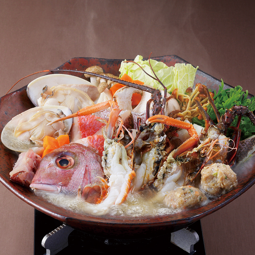 水揚げされた海の幸を、おいしさそのままに冷凍し、出荷。三河湾産の真鯛や蛤、伊勢海老など、8種の魚介の美味が鍋の中に舞い踊ります。
