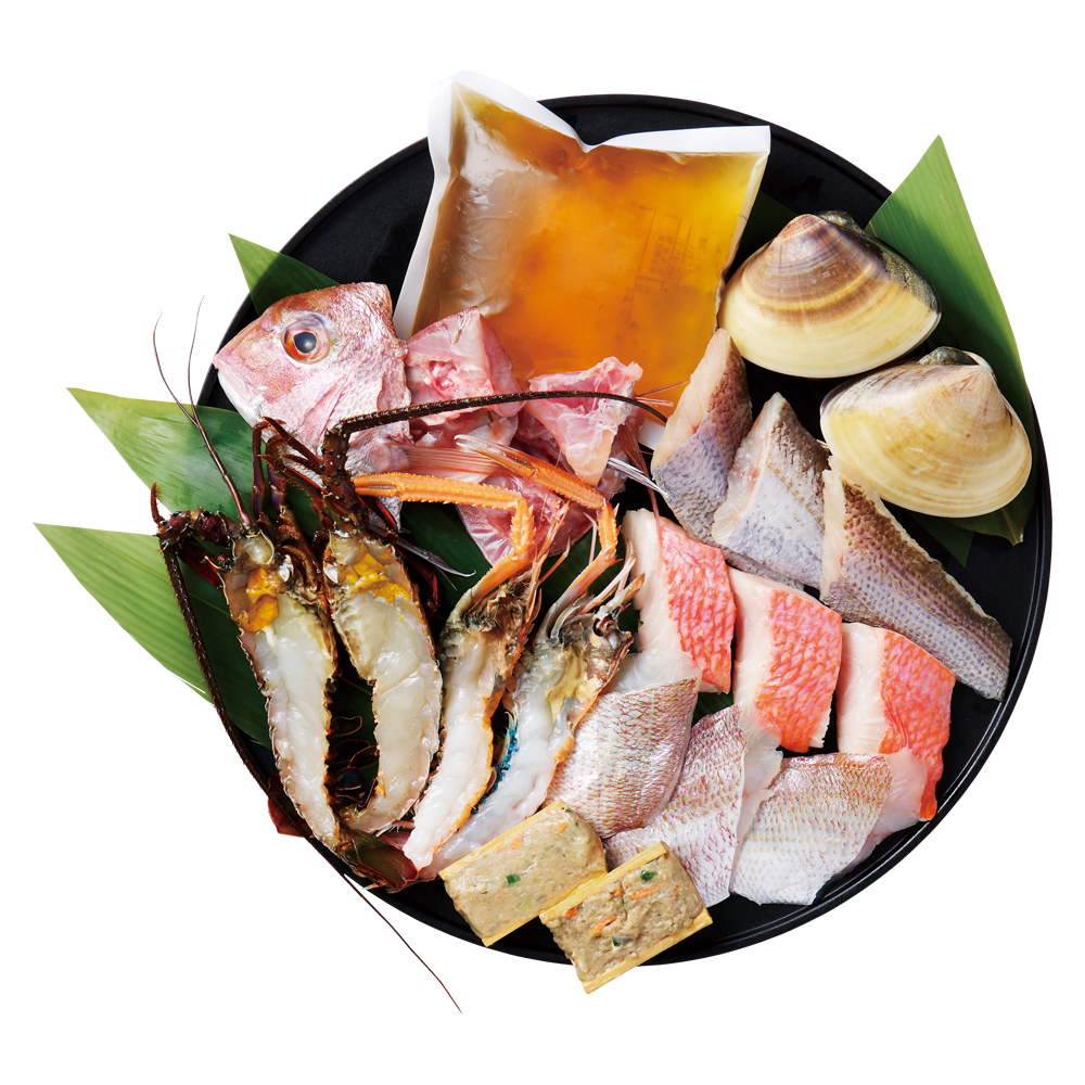 伊勢海老 半身2切120g、大はまぐり150g×2、赤座海老 半身2切80g、真鯛35g×3、真鯛(アラ)50g×3、黒むつ35g×3、金目鯛35g×3、つみれ50g(25g×2)、だし450g(希釈用)原料原産地:愛知県三河湾産
