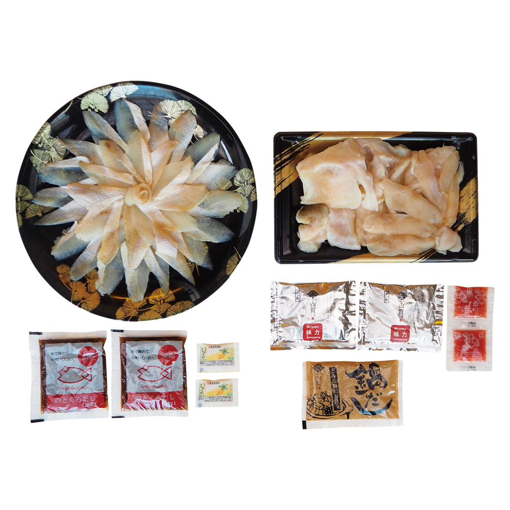 とらふぐちり250g、もみじおろし5g×2、鍋だし55g、ポン酢30ml×2、のどぐろしゃぶしゃぶ140g、のどぐろだし50g×2、おろししょうが2.5g×2 原料原産地:とらふぐ(国産・養殖)、のどぐろ(山口県下関産)