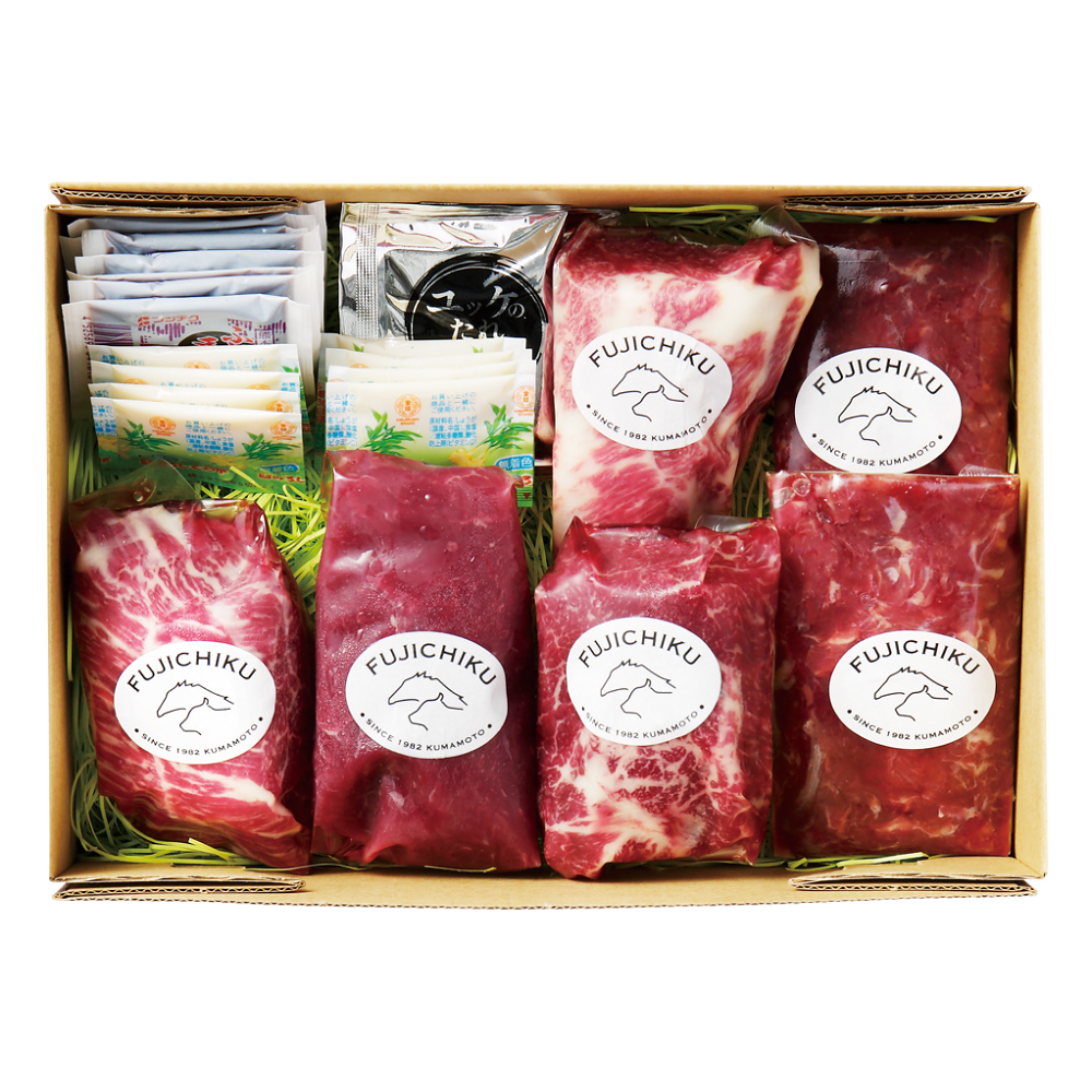 馬刺しメン(三枚バラ)80g、馬刺し大トロ80g、馬刺し中トロ80g、上赤身80g、馬刺しユッケ50g×2、馬刺しのたれ5ml×8、生姜3g×8、ユッケのたれ10g×2 原産地:カナダ・日本ほか