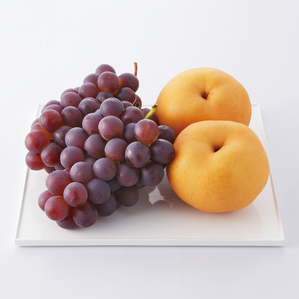 岡山県産グローコールマン2房(計1.0kg)、岡山県産あたご梨2玉(計1.2kg)、計2.2kg 最適な時期に収穫し、順次お届けいたします。配送日・お届け時期の指定は承れません。