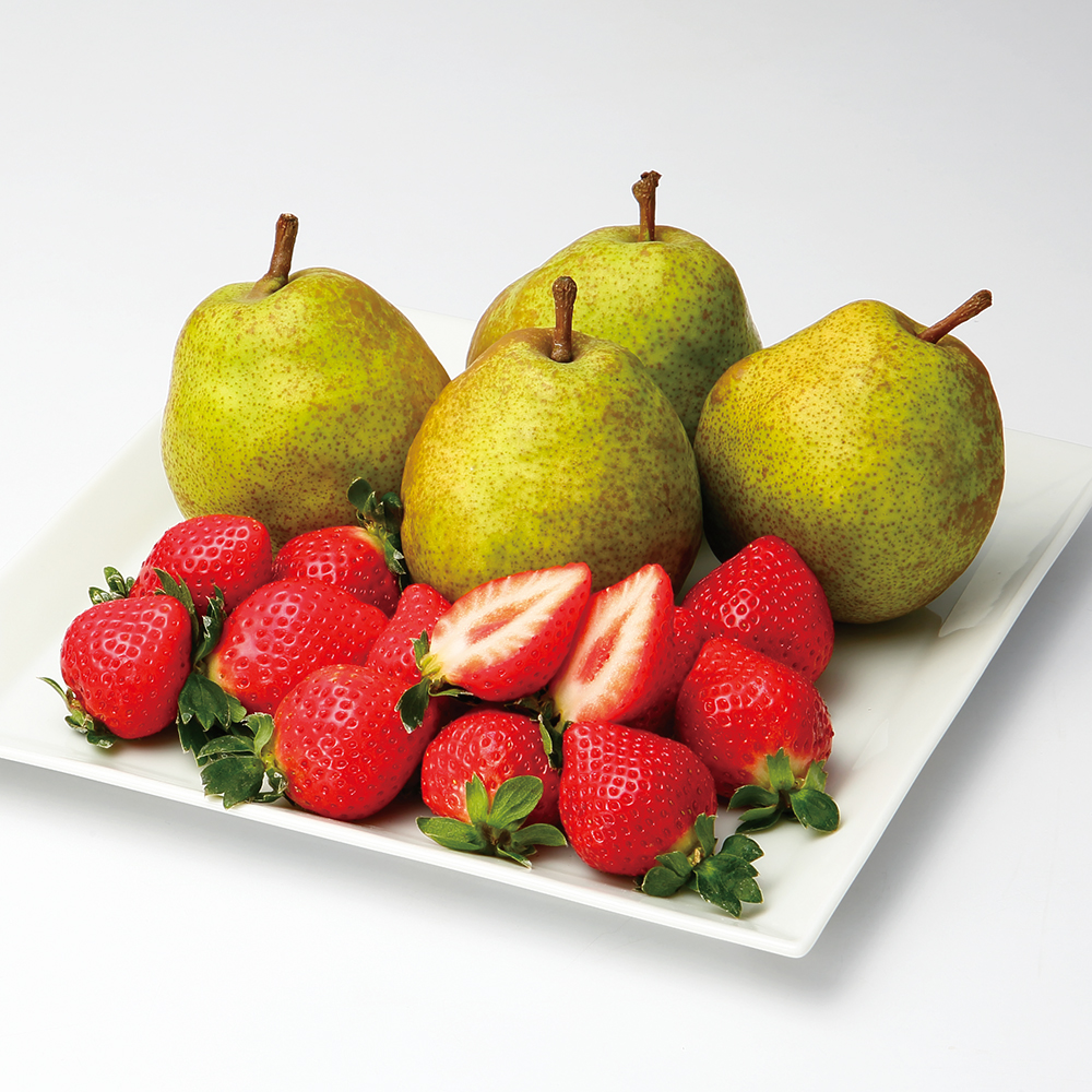 福岡県産いちご12~15粒(計270g)、山形県産ラ・フランス4玉(計1.0kg)、計1.27kg 最適な時期に収穫し、順次お届けいたします。配送日・お届け時期の指定は承れません。