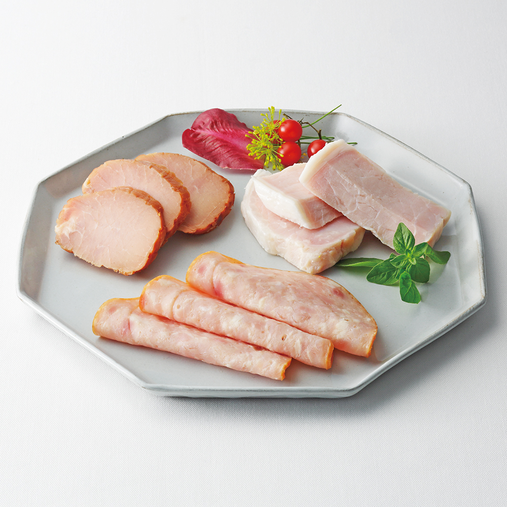 炭焼きみそ漬け焼豚170g、ロースハム(ノンスモーク)70g、ロースハム(スライス)40g、山桜燻製ボロニアソーセージ(スライス)40g、山桜燻製ベーコン(スライス)45g