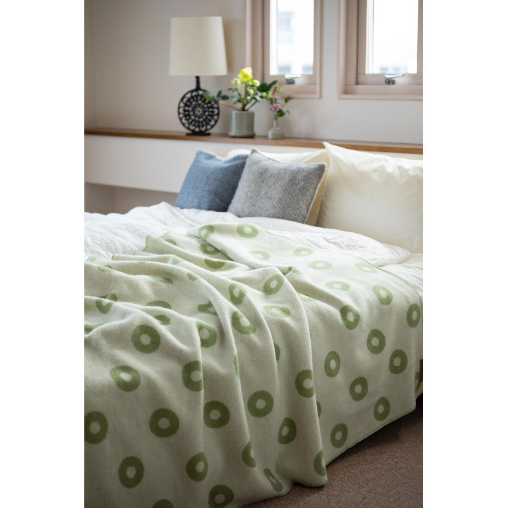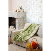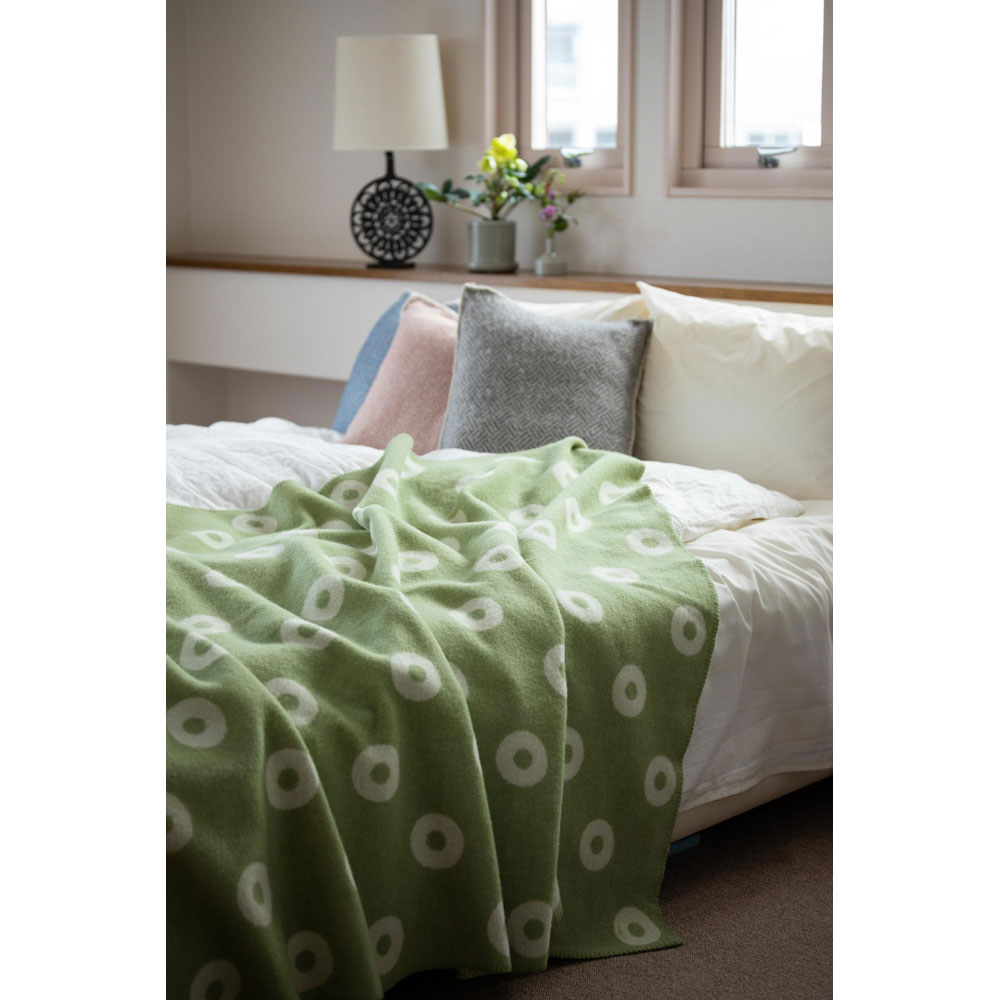 インテリアのアクセントになるグリーンのブランケットと明るいクッションカバーのセット