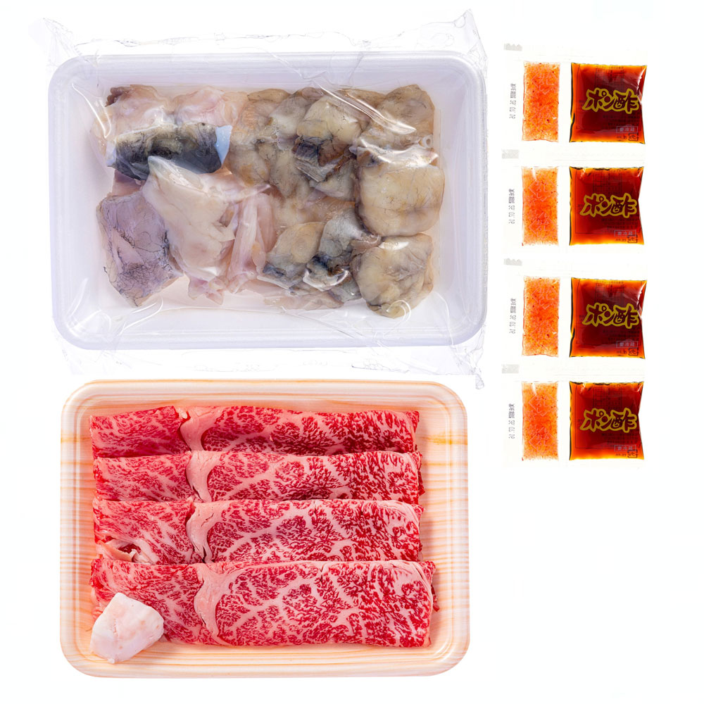 とらふぐあら150g、まふぐ切身150g、ぽん酢もみじおろし 15g×4、飛騨牛小分け肩ロースすき焼き用 150g