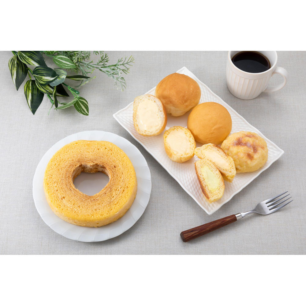 くりーむパンカスタード×2、塩バターくりーむパン×2、くりーむメロンパン(カスタード×1、メロン×1)、バームクーヘン×1
