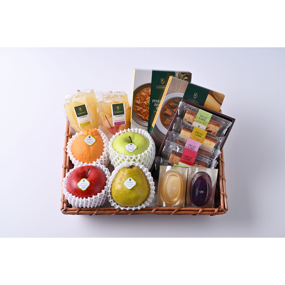 ラ・フランス、王林、デコポン、サンふじ各1個、ピュアフルーツジェリー(白桃、ピオーネ各1個)、マンゴーカレー×1個、パイナップルハッシュドビーフ×1個、フルーツデザートミニパック(フルーツポンチ、ラ・フランス各1個)、フルーツケーキ5個入(フルーツミックス2個、オレンジ、ショコラマロン、チェリー各1個)、エコバッグ×1個