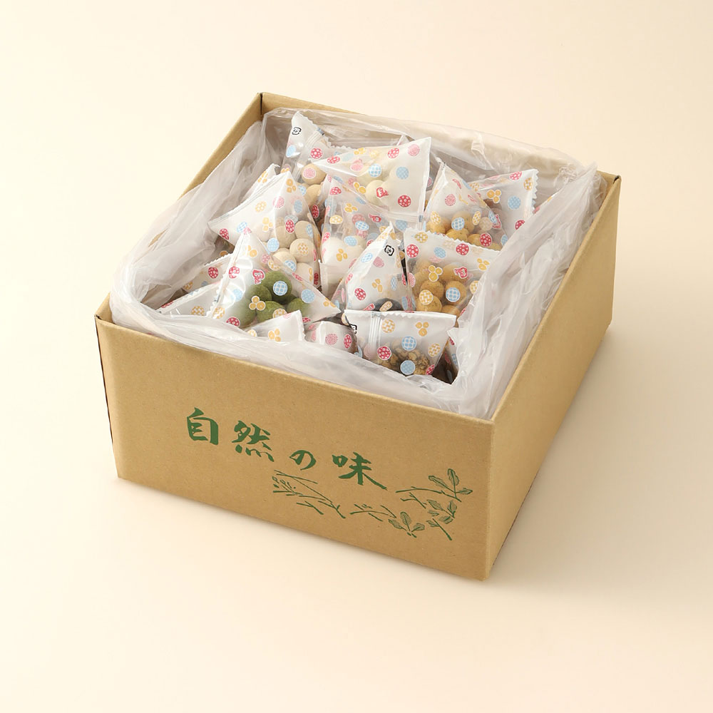 10種(竹炭豆・抹茶みるく豆・きなこ豆・黒胡麻とうふ豆・みるく珈琲豆・あんころ豆・昆布豆・和三盆糖豆・ホワイトちょこれーと豆・ペペロンチーノ豆 各5袋) 計50袋