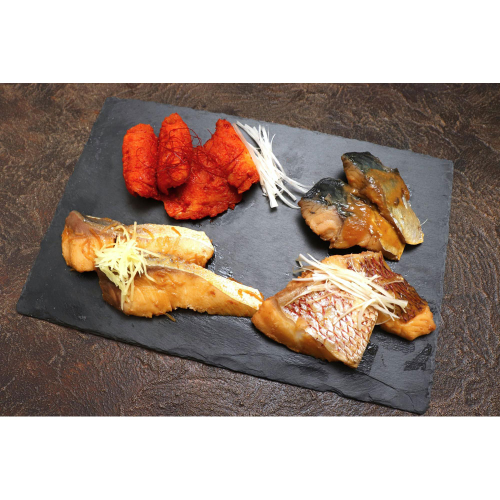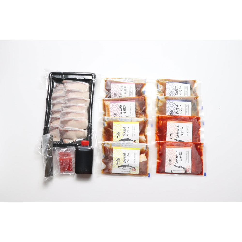 かぼすぶり切身250g×1、かぼすポン酢70ml×1、もみじおろし5g×4、だし昆布5g×1、真鯛煮つけ70g×2、ぶり生姜煮70g×2、さば味噌煮70g×2、はも旨辛煮70g×2