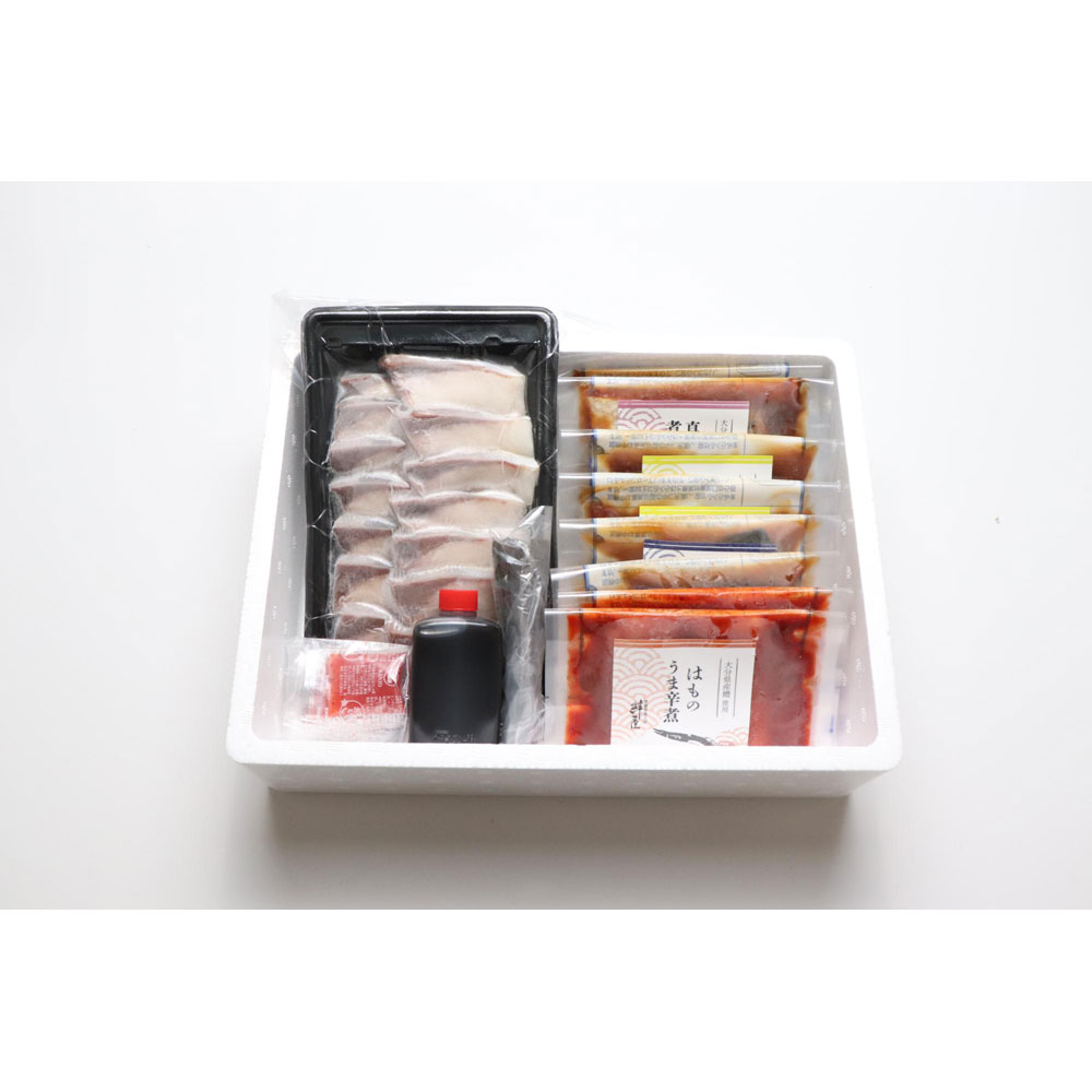 大分のブランド魚「かぼすぶり」のしゃぶしゃぶと大分県産のブリや真鯛、天然鱧、近海のサバを使った煮魚の福袋です。