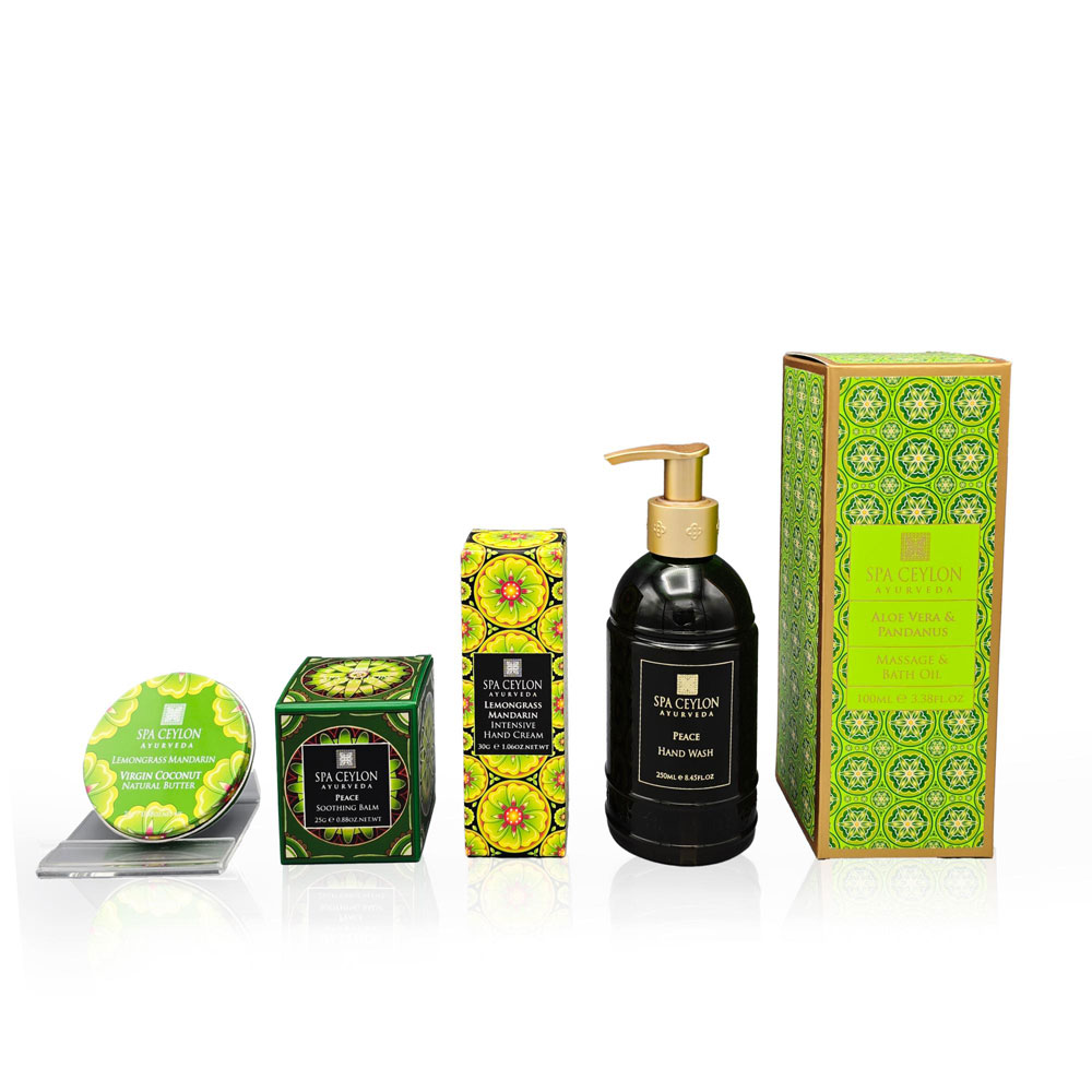 <セット内容>アロエ ベラ & パンダヌス マッサージ & バス オイル 100ml、ピース バーム 25g、レモングラス マンダリン インテンシブ ハンド クリーム 30g、ピースハンド ウォッシュ 250ml、レモングラス マンダリン バージン ココナッツ ナチュラル バター25g