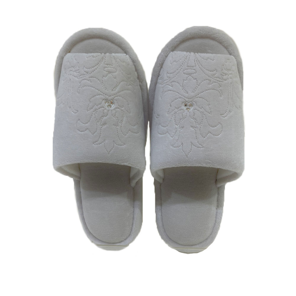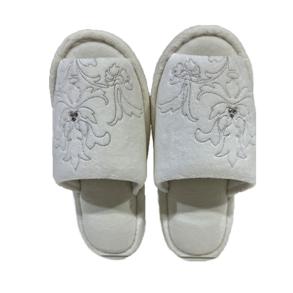 ヨーロッパの建造物に見られるアラベスク調のオーナメントモチーフをアレンジしたモダンさを感じられるデザイン。艶のある細番光沢糸とパールのような上品な煌めき感ある糸をミックスしたボリュームあるベースにジェットプリントを施しました。ポイントに取り付けたラインストーンがさらに高級感を出しています。