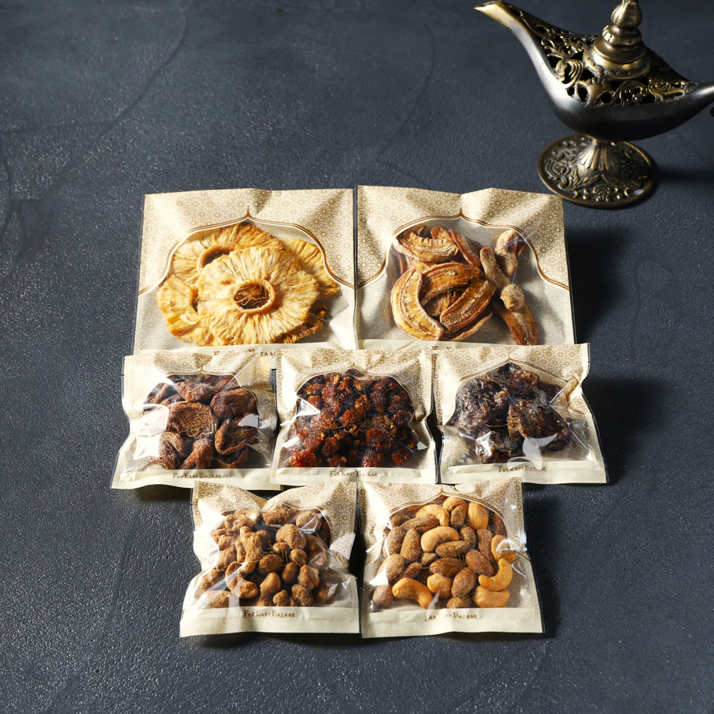 ドライフルーツ:エジプシャンデーツ、ルエロパイナップル、アップルバナナ、インカベリー、アプリコット 各50g×1袋、ナッツ:花蜜キャラメルナッツ、ハリッサナッツ 各50g×1袋