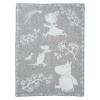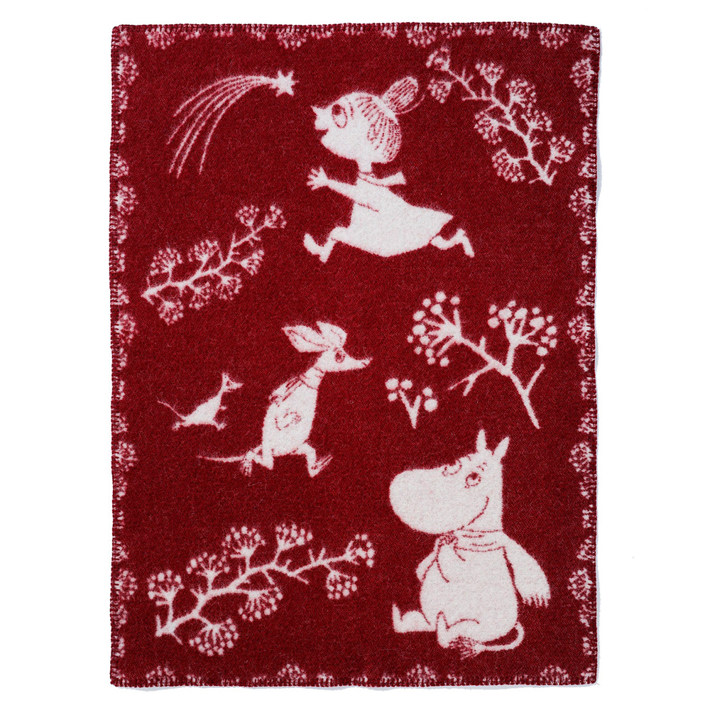 ムーミン80周年イヤーに届いた、とっておきのブランケット。縁をぐるりと囲むように描かれた木の枝が、まるで繊細なレースのように見える柄。複数の色が混ざったニュアンスのあるグレー、ワインのような深みのあるレッド、雪に映えそうな鮮やかなブルーの3色です。アウトドアや車の中、オフィスでのひざ掛けにもおすすめ。原産国:ラトビア