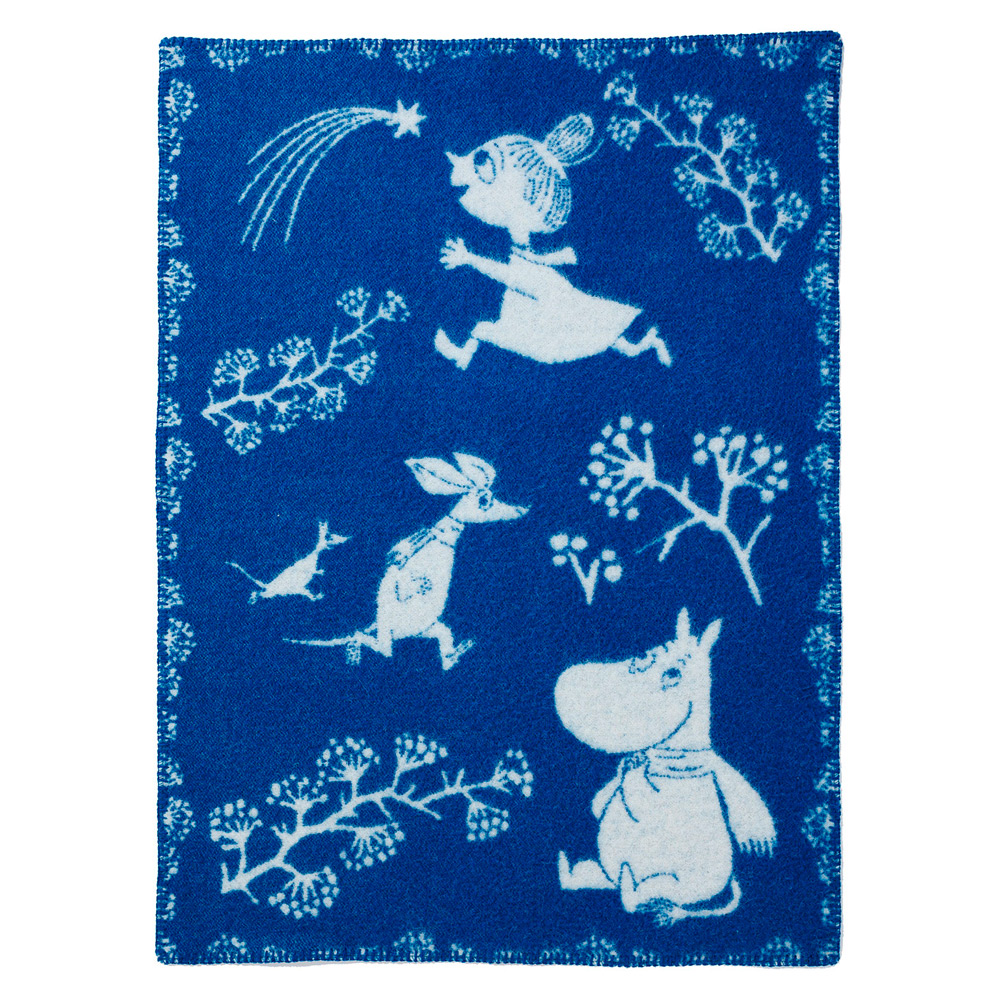 ムーミン80周年イヤーに届いた、とっておきのブランケット。縁をぐるりと囲むように描かれた木の枝が、まるで繊細なレースのように見える柄。複数の色が混ざったニュアンスのあるグレー、ワインのような深みのあるレッド、雪に映えそうな鮮やかなブルーの3色です。アウトドアや車の中、オフィスでのひざ掛けにもおすすめ。原産国:ラトビア