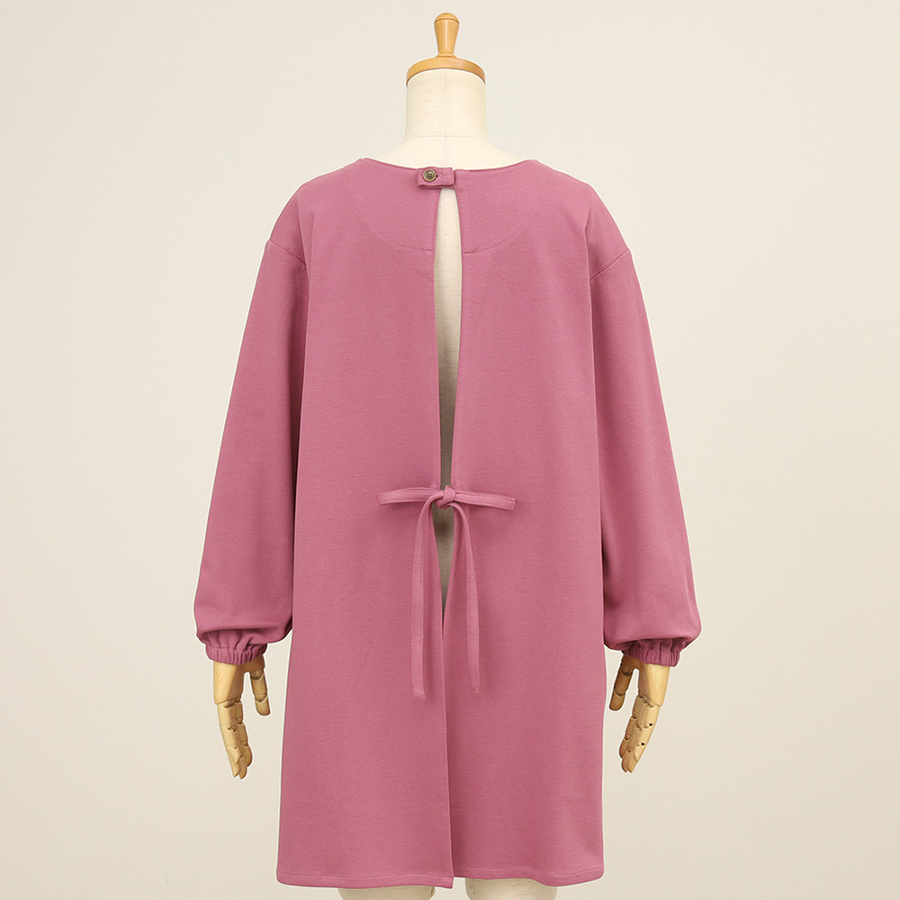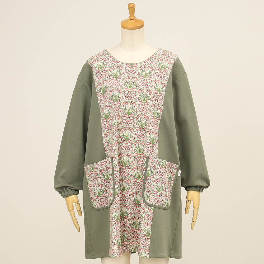 上品な光沢があるコーデュロイ素材と無地のニット素材を組み合わせたかっぽう着。両脇の切り替えが細見え効果もあり、すっきりと着こなせる一枚です。