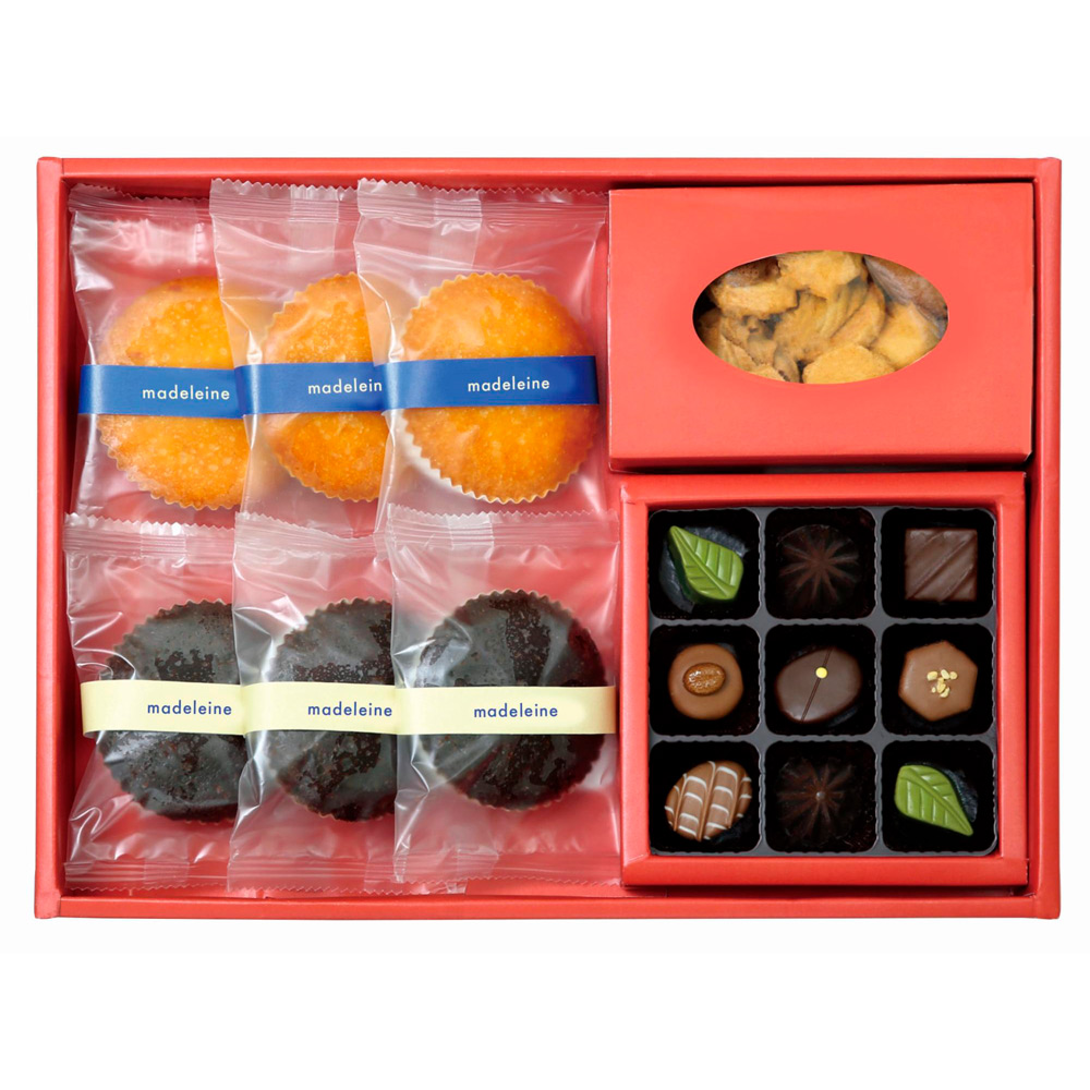 チョコレートマドレーヌ3個、マドレーヌ3個、レユニールクッキー1袋(60g)、チョコレート9個