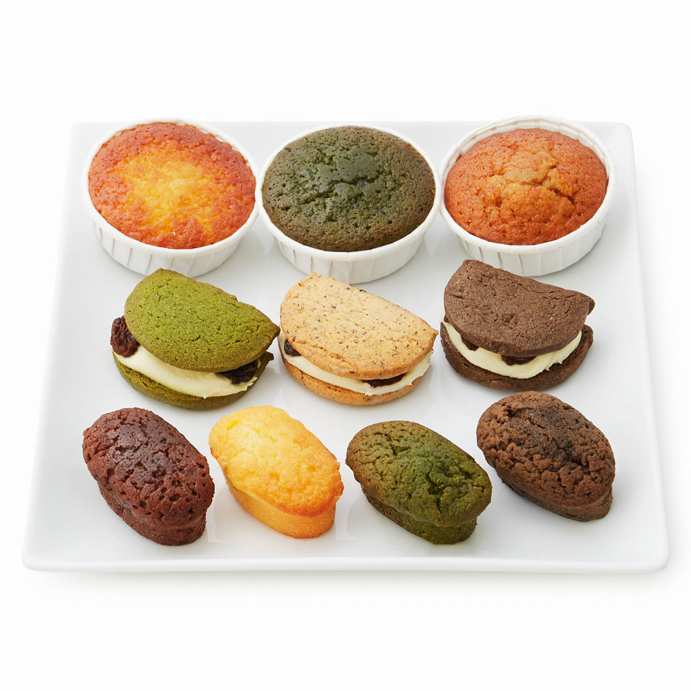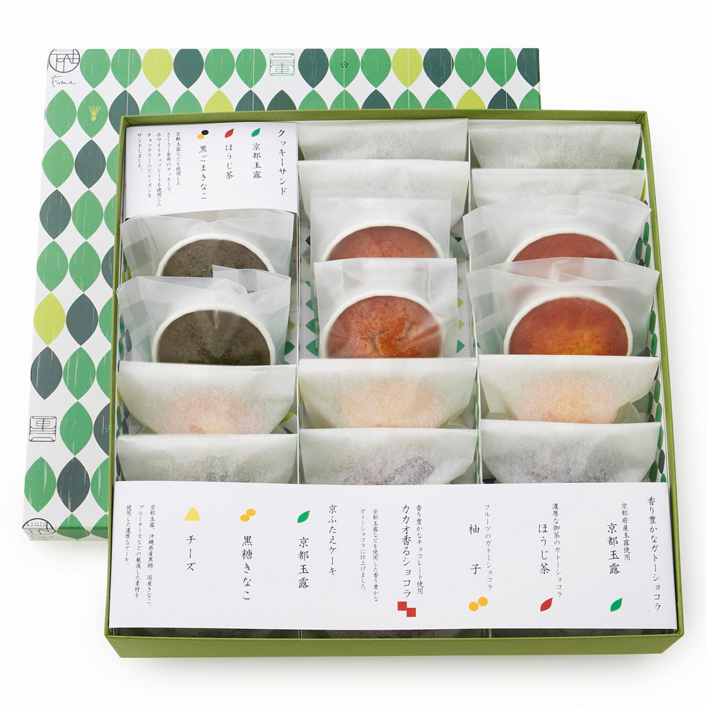 ガトーショコラ:玉露×3個、ほうじ茶×3個、ショコラ×3個、柚子×3個、ケーキ:京都玉露×2個、黒糖きなこ×2個、チーズ×2個、クッキーサンド:京都玉露×2個、ほうじ茶×2個、黒ごまきなこ×2個 計24個