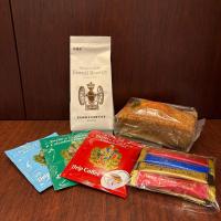 限定オリジナルコーヒー×1袋、ドリップコーヒー×3種(アラビアの真珠・コロンビアのエメラルド・イパネマの瑠璃 各1個)、スティックインスタントコーヒー×3種(オリジナル・キリマンジャロ・ブルーマウンテン 各4本)、限定パウンドケーキ×1本、限定トートバック×1個、限定ポーチ×1個