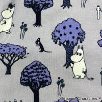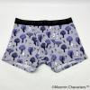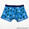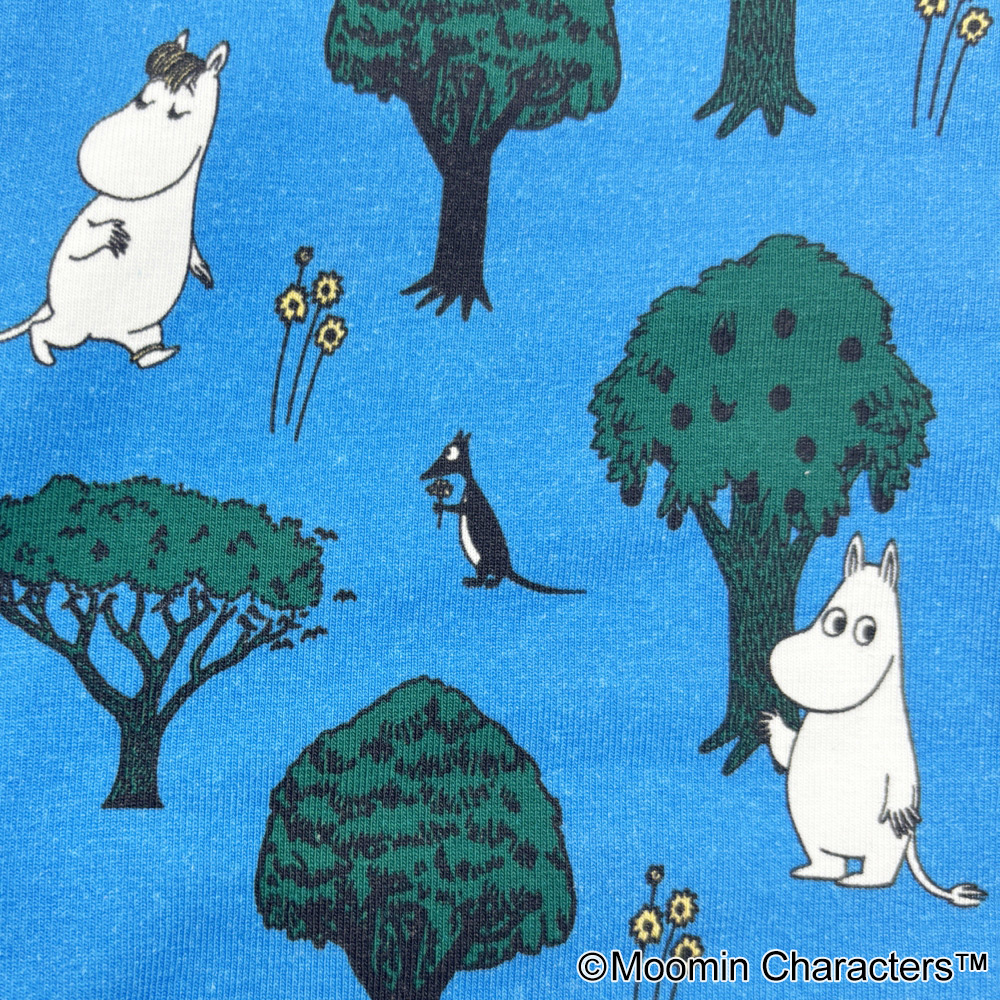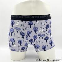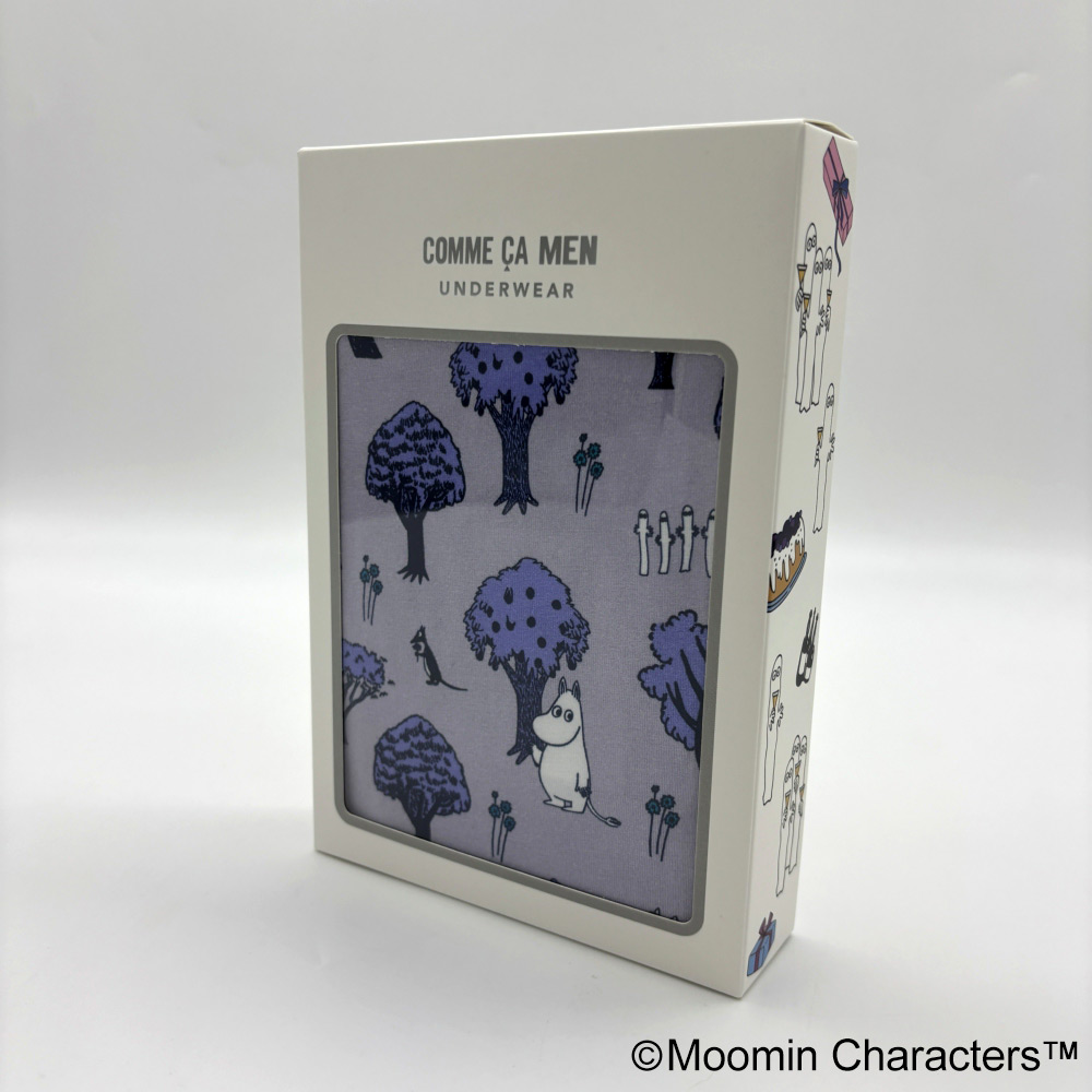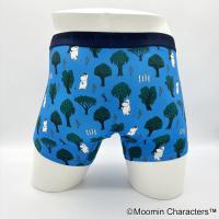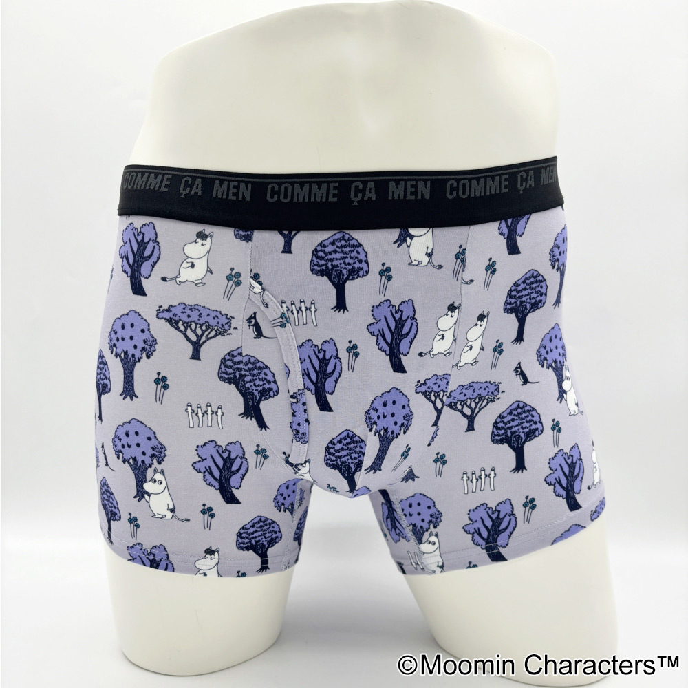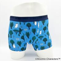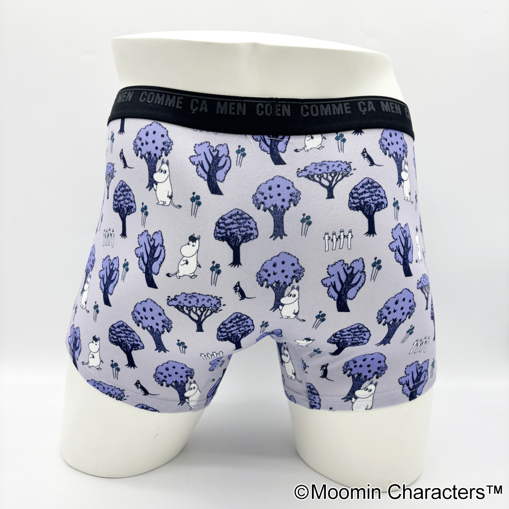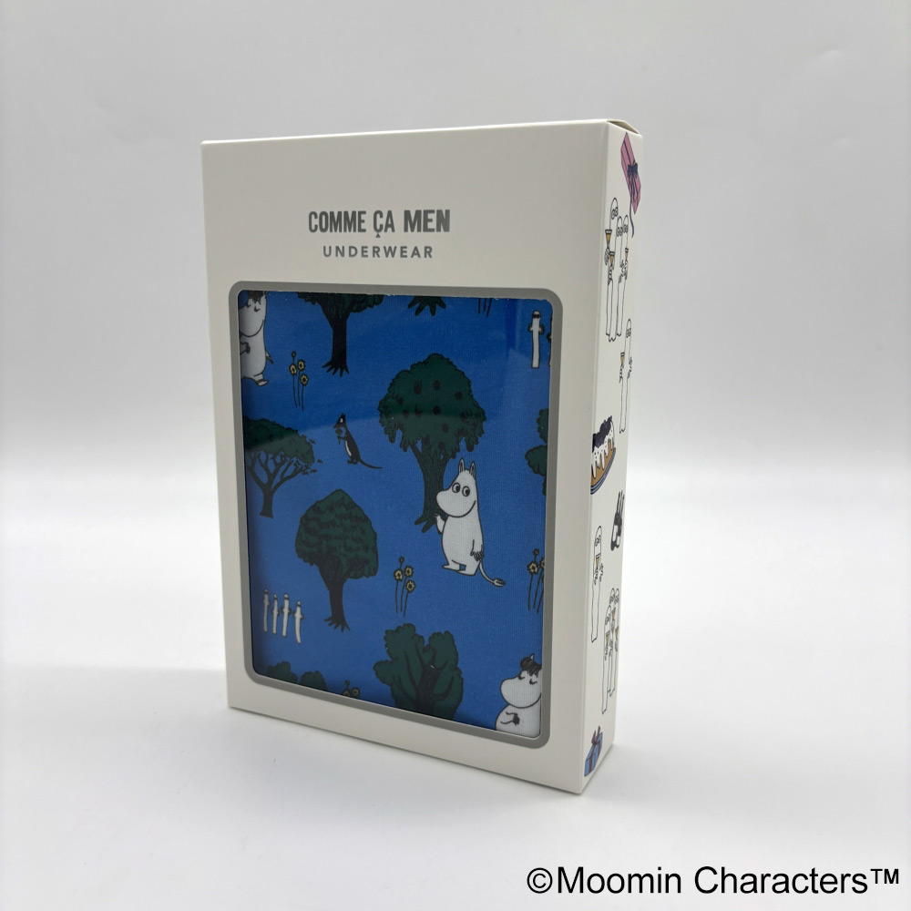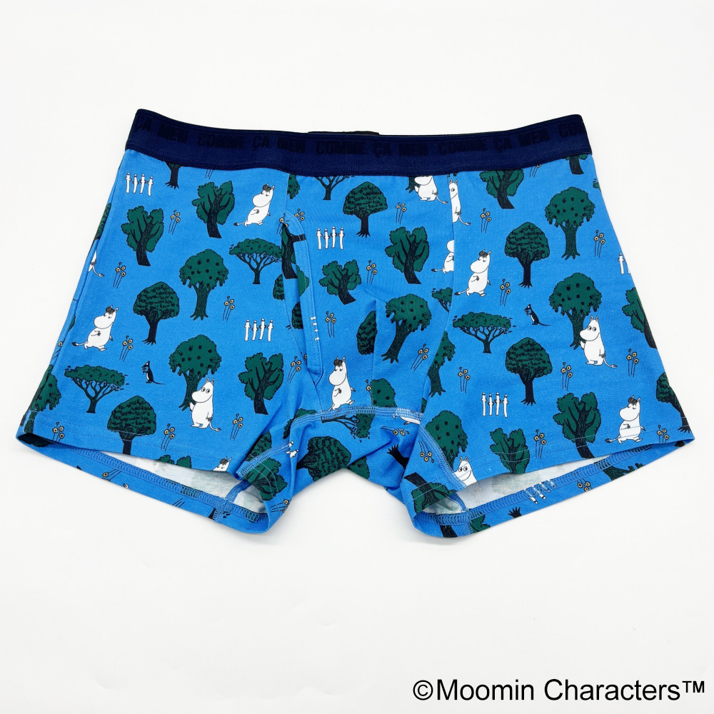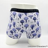 コムサメンとムーミンのコラボ柄ボクサーパンツ。ムーミンと仲間たちが森の中を楽し気に散策中。レギュラー丈、ウエストゴムは肌触りのいい裏パイル仕様、前開きタイプ。ムーミン柄のパッケージ入り。