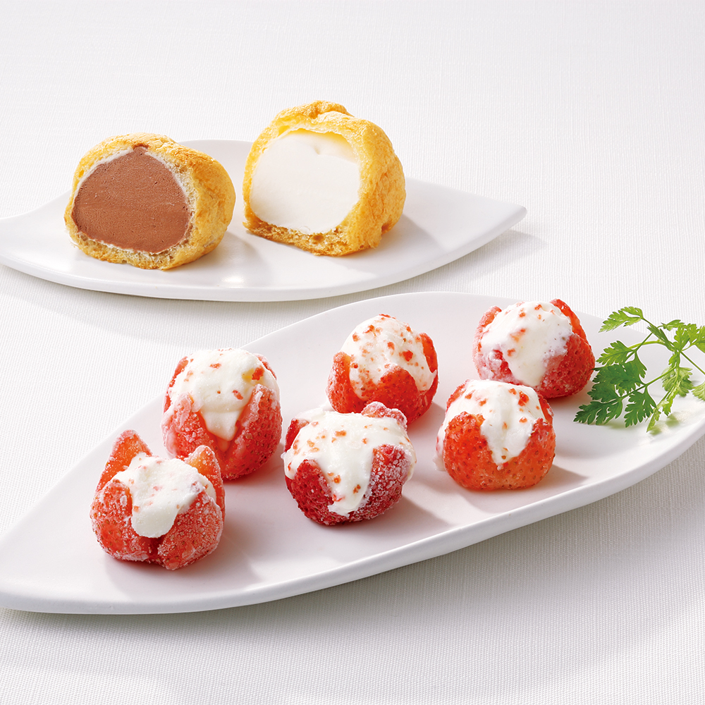 お花のように開いた苺の中にアイスクリームを入れた可愛らしい苺のアイスとシューアイス2種のセットです。