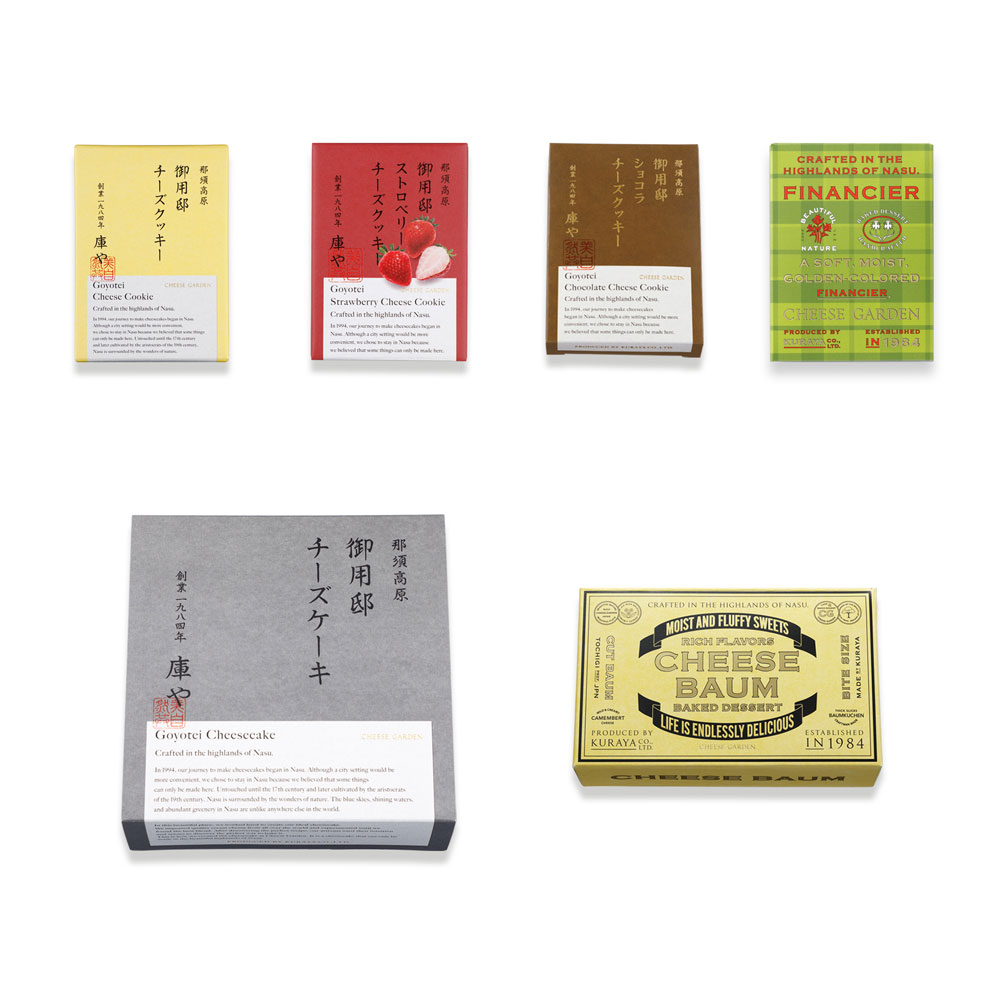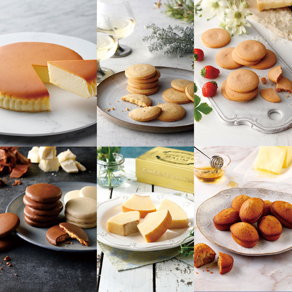 御用邸チーズケーキ×1個、御用邸チーズクッキー4枚入×1箱、フィナンシェ2個入×1箱、チーズバウム4個入×1箱、御用邸ショコラチーズクッキー2枚入×1箱、御用邸ストロベリーチーズクッキー2枚入×1箱