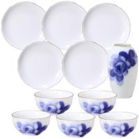 大倉陶園を代表するデザイン「ブルーローズ」から湯呑と花生を、原料・焼成温度など卓越した技術で生み出す大倉陶園独自の白磁から15センチ銘々皿を取り揃えたセットです。湯呑で日本茶を、15センチ銘々皿にお茶菓子を、花生をテーブルに置けば 「和」のシーンを演出します。