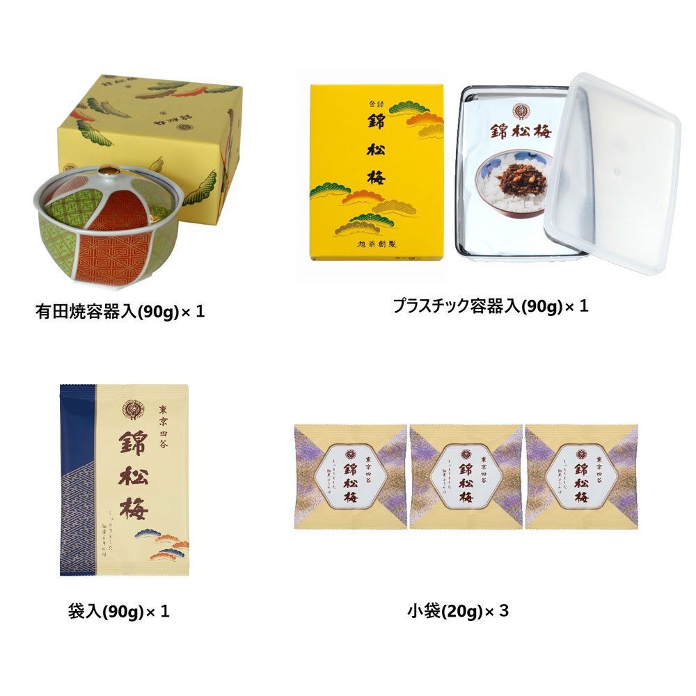 有田焼容器入(90g)×1個、プラスチック容器入(90g)×1個、袋入(90g)×1個、錦松梅の小袋(20g)×3個