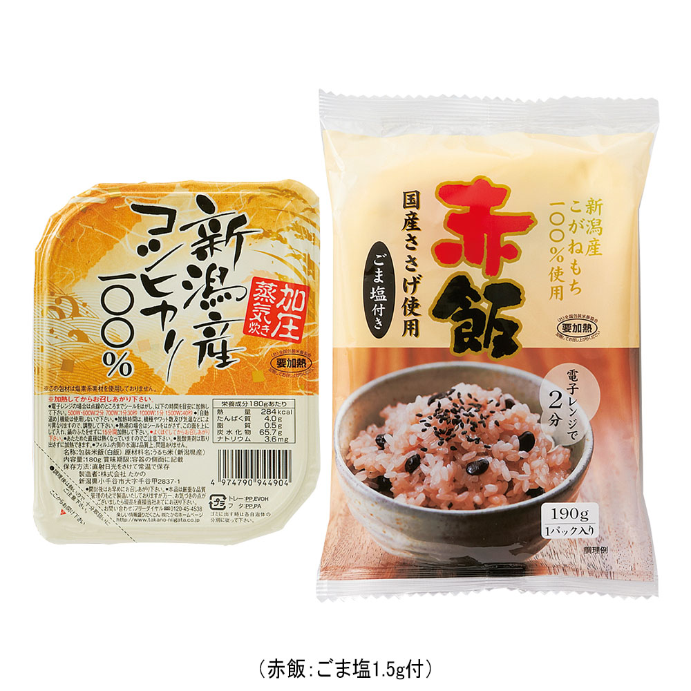常備しておくと安心・便利なパックご飯。新潟県産のこしひかりご飯とこがねもち赤飯をご用意しました。