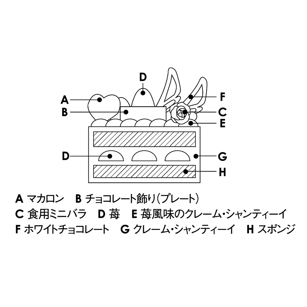 〈ブールミッシュ〉で人気の苺をサンドしたショートケーキ。苺風味のクレーム・シャンティーイとフレッシュな苺、ハートのマカロンなどで華やかに仕上げました。