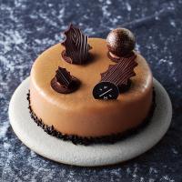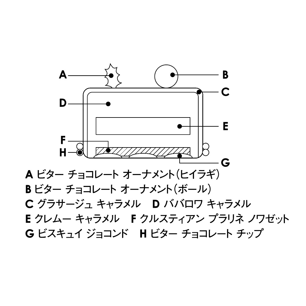 テクスチャーの異なる2層が織り成す深い味わいのキャラメルケーキ。キャラメルのほろ苦さとヘーゼルナッツの香ばしさ、なめらかなババロワとサクサクとした生地の歯応えがバランスよく調和。