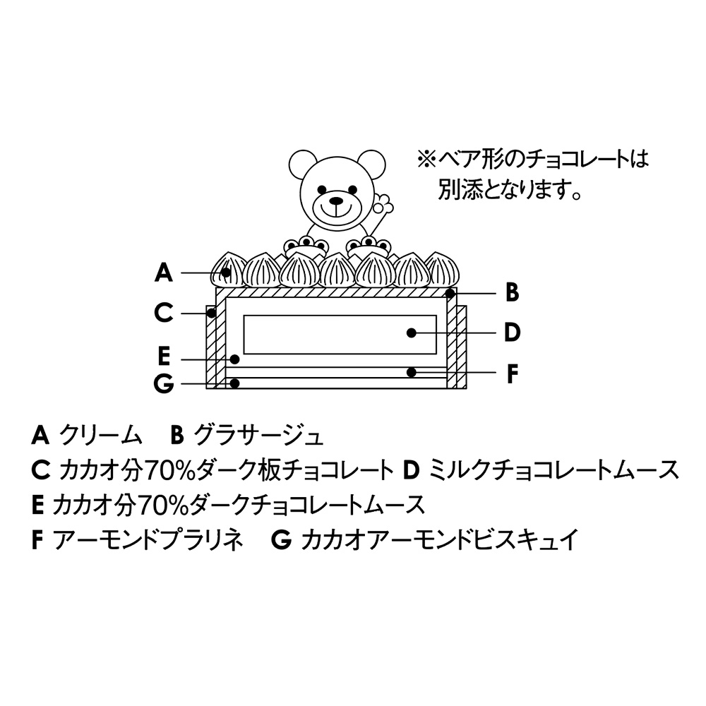 ピスタチオ風味のベアチョコは高島屋限定。カカオ分70%のクーベルチュールを贅沢に使ったダークチョコレートムースに、ミルクチョコレートムースや香ばしいアーモンドプラリネのビスキュイを重ねました。※ベア型のチョコレートは別添となります。