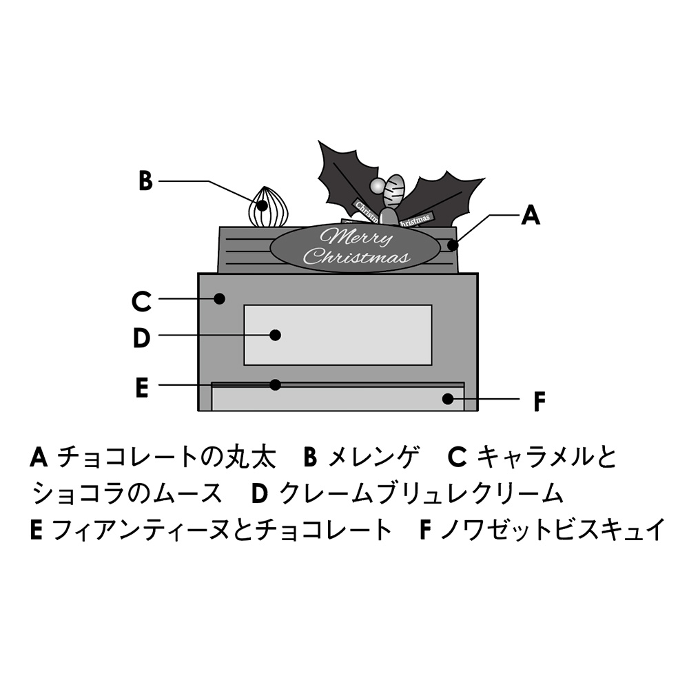 ショコラとキャラメルのムースにまろやかなクレームブリュレを閉じ込めたチョコレートケーキにビュッシュを飾ったノエル仕立て。