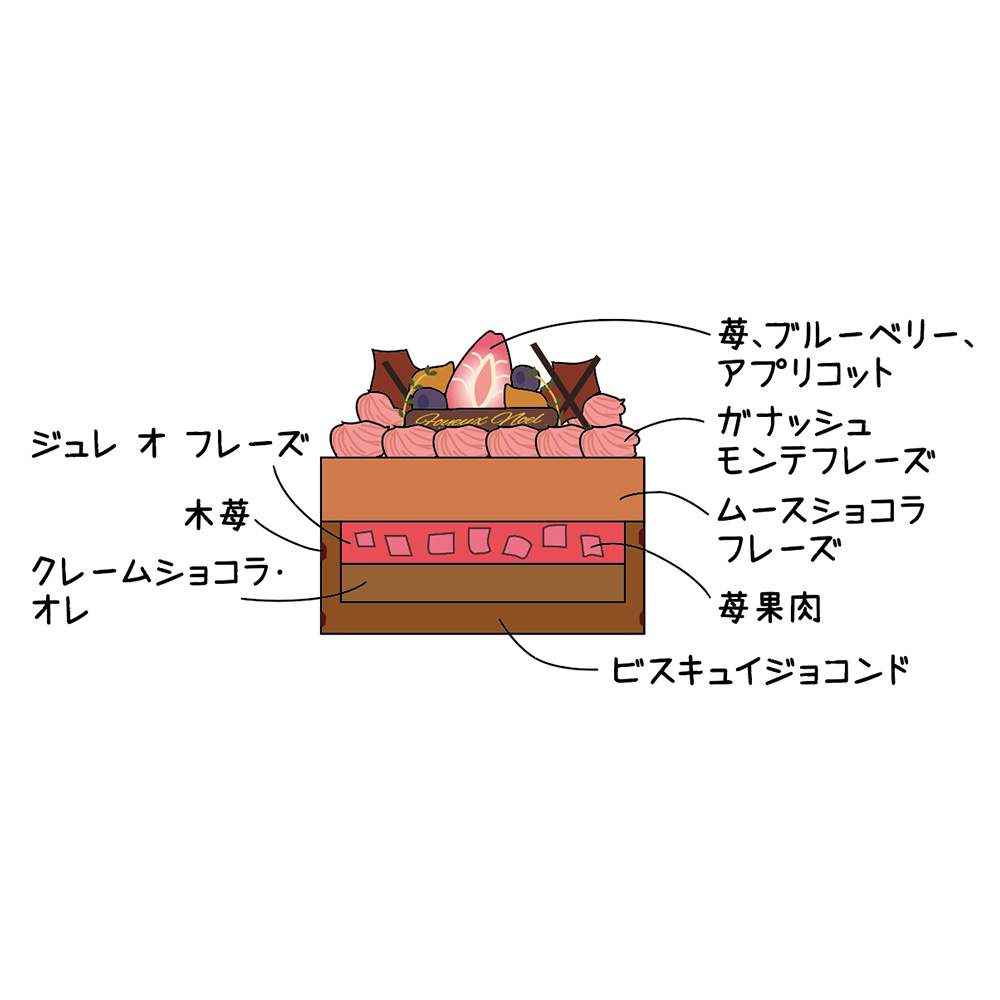 主役は、甘酸っぱい旬の苺とチョコレート。中には、苺のジュレとミルクとカカオのクレームショコラオレ。底のビスキュイジョコンドで見た目も可愛く。