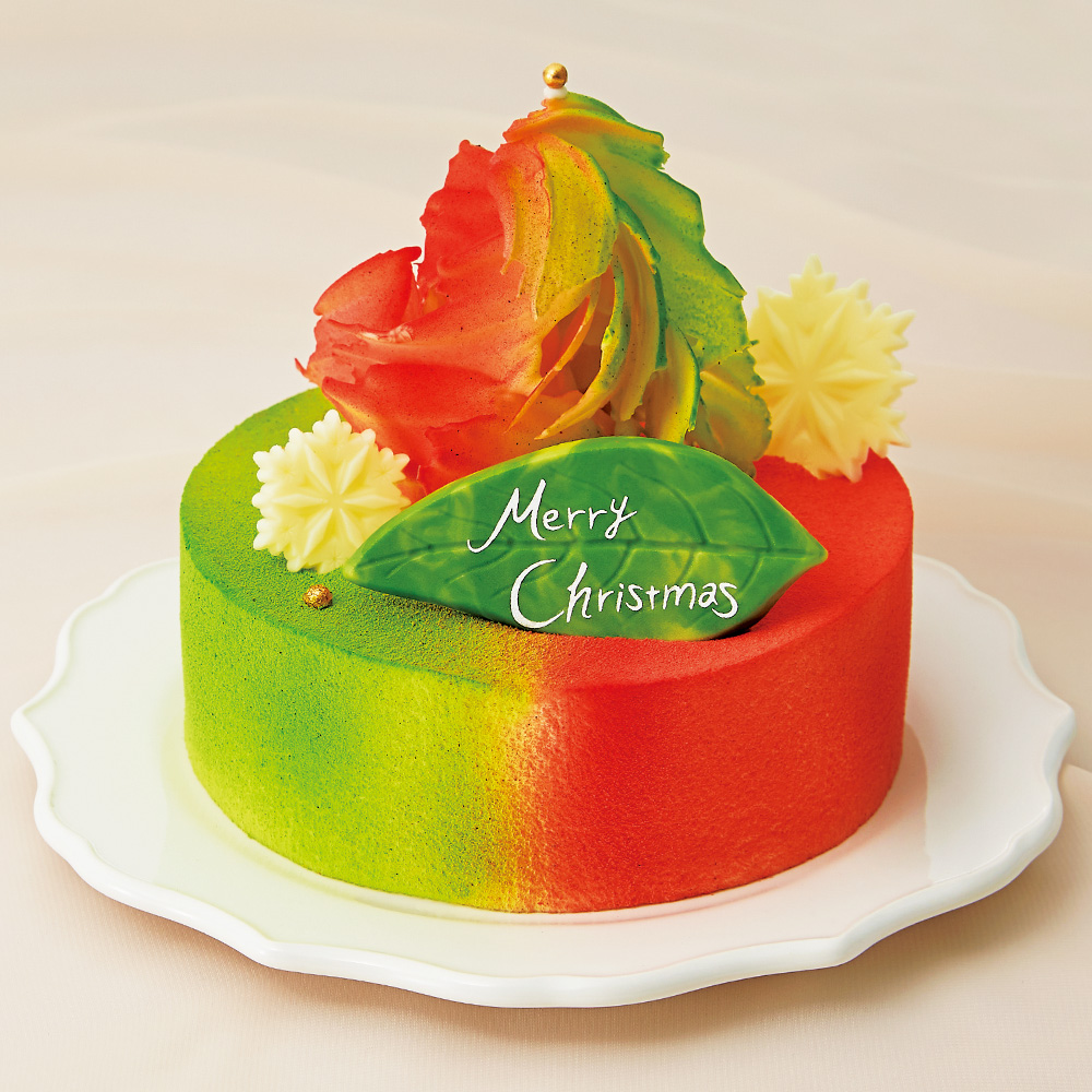 ふんわりと軽めのピスタチオのムース、芳醇なバニラの香りを閉じ込めたくちどけの良いホワイトチョコのムース。キリッとしたリキュールをきかせて、エッジを立てています。チョコレートのモミの木をクリスマスカラーに。
