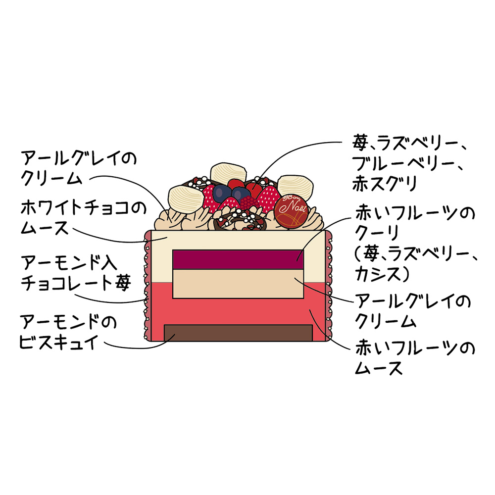赤いフルーツ(苺、ラズベリー、カシス、スグリ)の甘酸っぱさにホワイトチョコレートの優しい甘さを合わせ、アールグレイの香りをプラスしました。