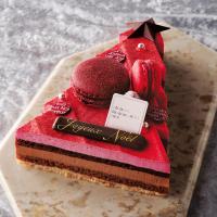 口どけなめらかなショコラクリームとフランボワーズのフルーティーな酸味を閉じ込めた、見た目も味わいも、クリスマスらしいケーキ。サクッとしたフィヨンティーヌの食感に、プラリネのコク深い層とムースの柔らかさとのコントラストが楽しい聖夜限定の一品です。