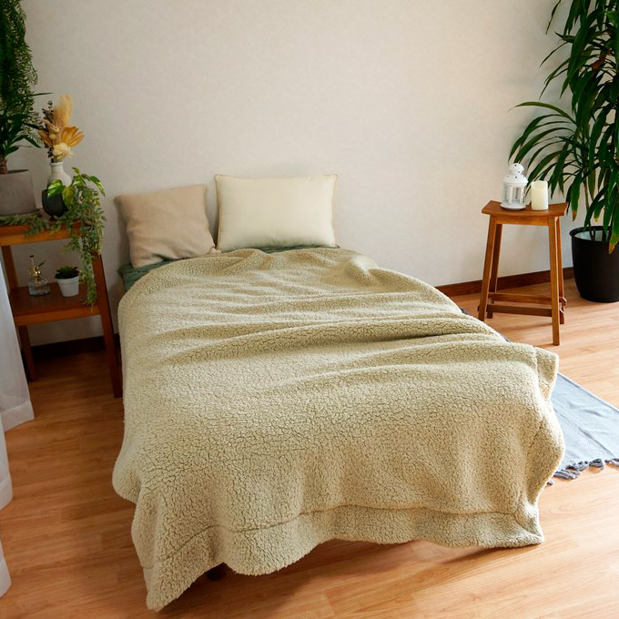 羊の毛のようなふんわり、もこもこの肌触りで、あたたたかくおやすみいただけます。ご家庭で洗っていただけます。