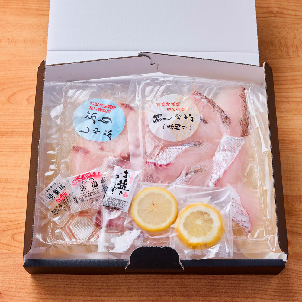 新鮮な若狭湾産の鯛と国産ぶりを急速冷凍し、鮮度を保ったままお届けします。若狭湾で水揚げされた「真鯛」は、あっさりしつつも旨味と上品な甘みがあるのが特徴です。寒い時期にとれる寒ブリは、身が締まり、脂がのって絶品です。特製のあごだしスープがしゃぶしゃぶを一層引き立てます。旨味が凝縮されたスープでいただくしゃぶしゃぶは、まさに至福のひとときです。お好みで3種の塩(アンデス岩塩、藻塩、赤穂の塩)もお楽しみいただけます。さらに、福井県高浜町内浦地区の無農薬栽培の「うちうらレモン」を添えて、さっぱりとした味わいをプラスできます。ご自宅で贅沢な味わいを楽しめます。日本の食文化が詰まった逸品を、どうぞご堪能ください。※画像は調理・盛りつけの一例となります。レモン以外の野菜は商品に含まれておりません。