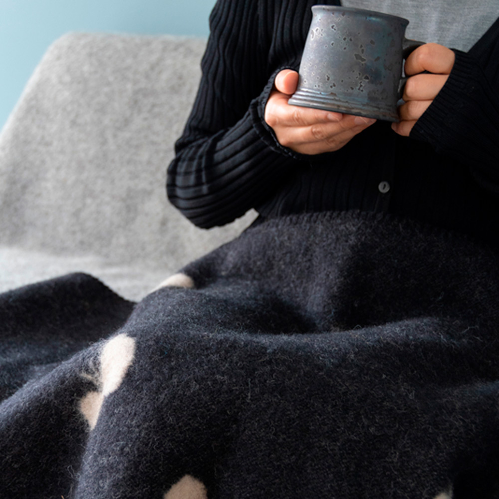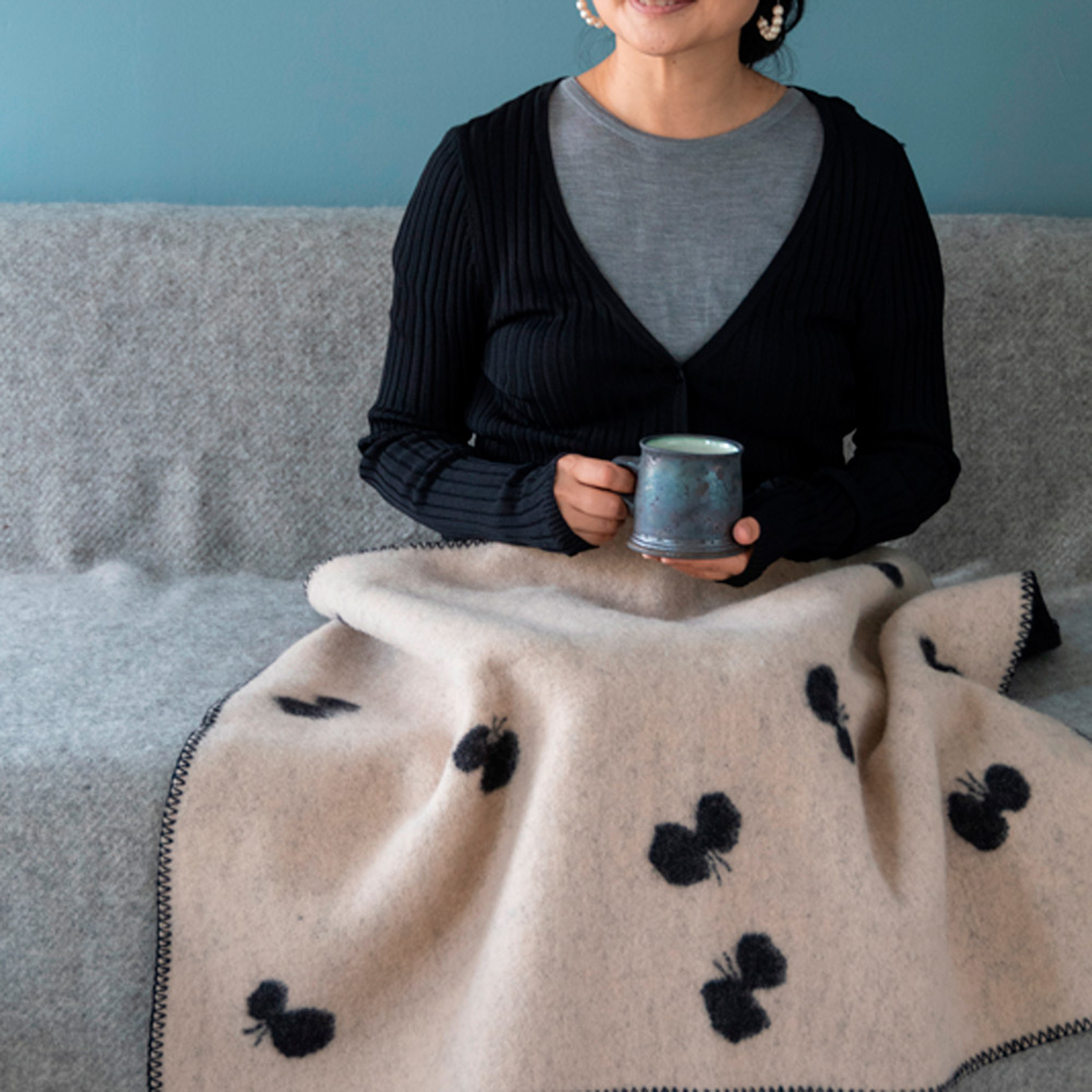 ミナ ペルホネンとクリッパンのコラボレーションブランケットとして、人気を誇る「CHOUCHO」。ペルホネンとは、フィンランド語で「ちょうちょ」のこと。まさにブランドを象徴するような一枚で、蝶たちが語らいながら舞う様子がデザインされています。オフィスでのデスクワークや在宅ワーク、週末のおうち時間に1枚あると便利なのがウールのひざ掛け。ブランケットを使って足元や下半身を温めてあげてください。コンパクトなミニブランケットはドライブやアウトドアでも活躍します。大切な人へのギフトにも。原産国:ラトビア