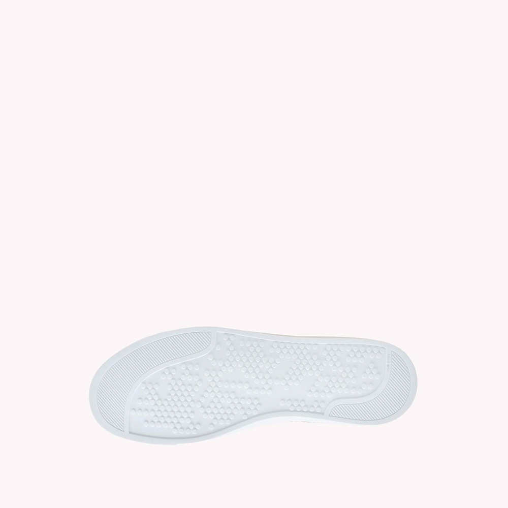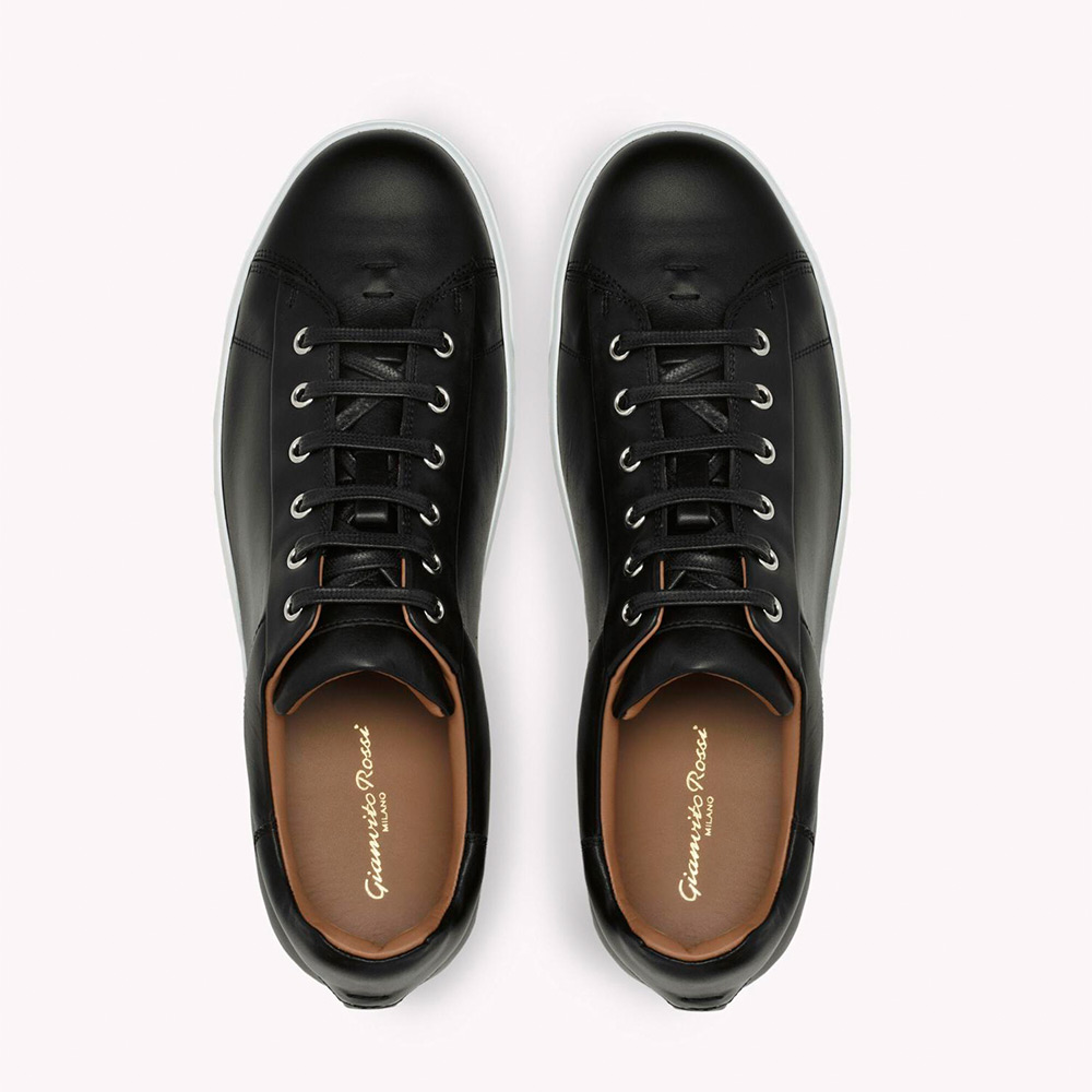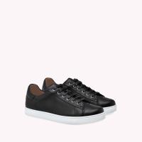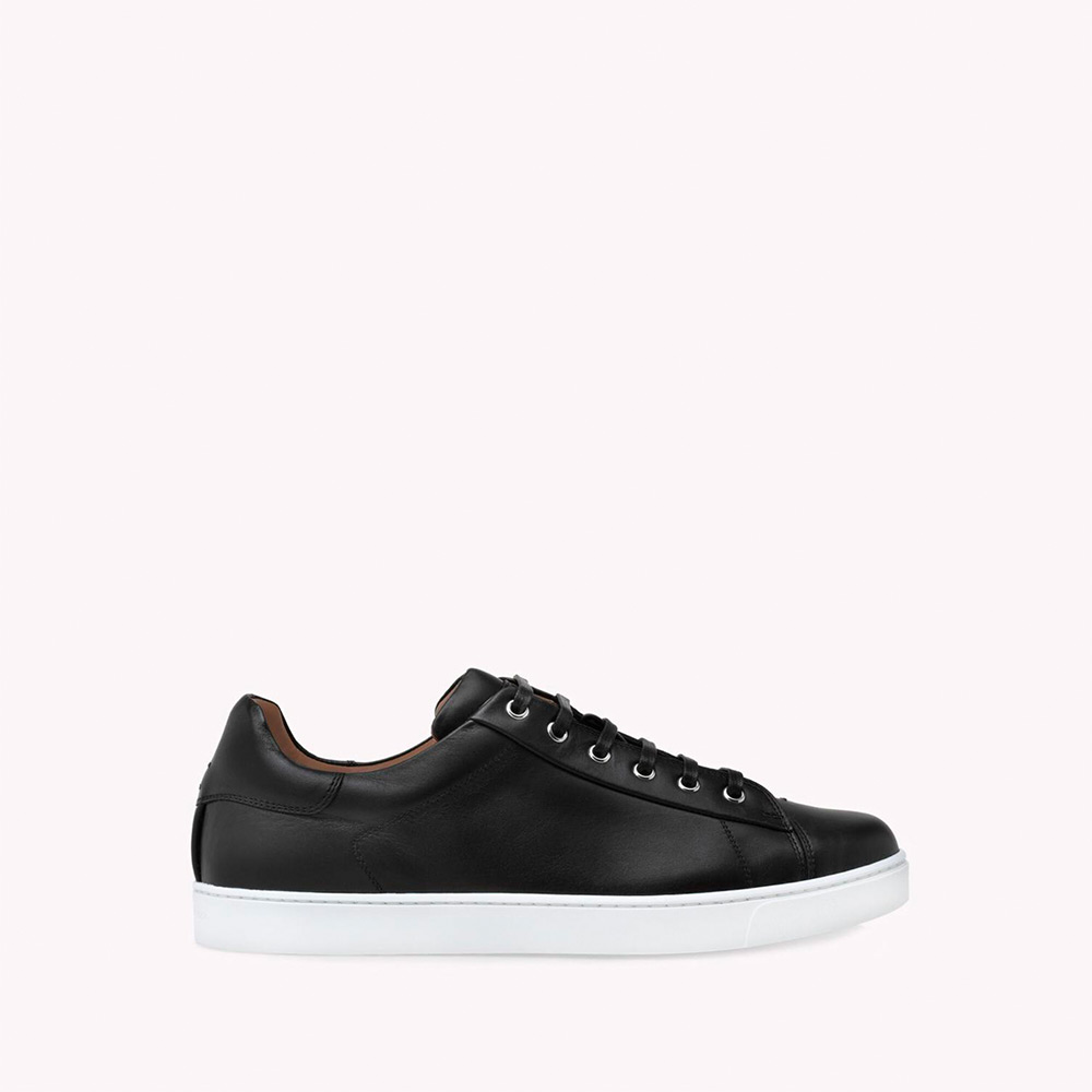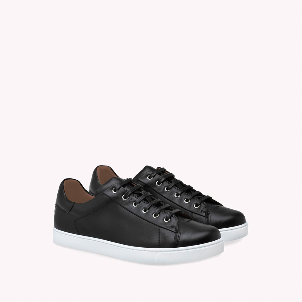 メタルアイレットで装飾されたレザー製のLow Topスニーカー。シューレースとラバー製のソールは本体と同系色で揃えています。