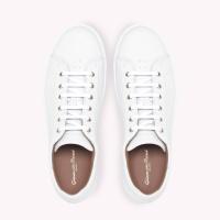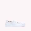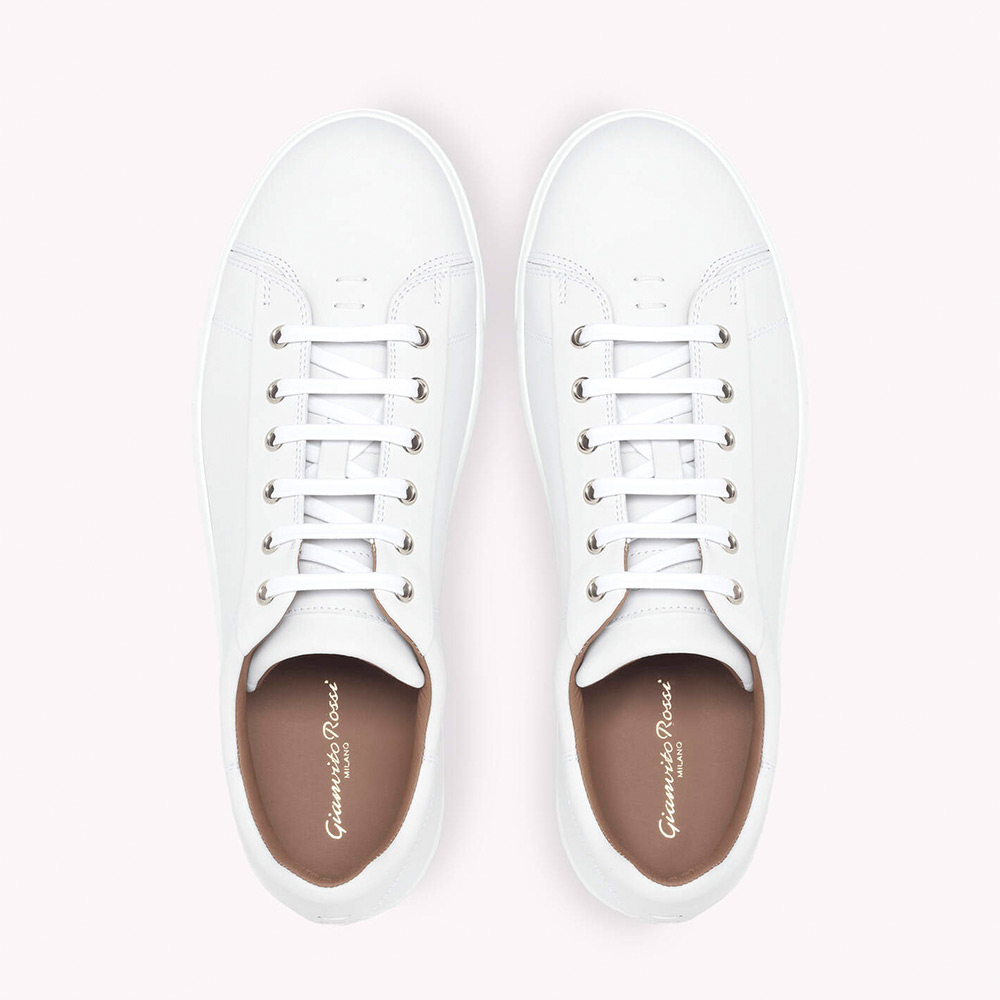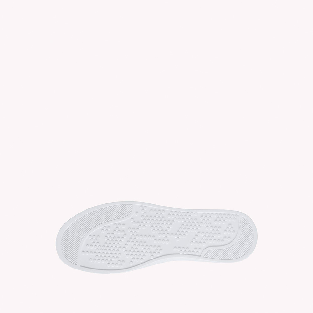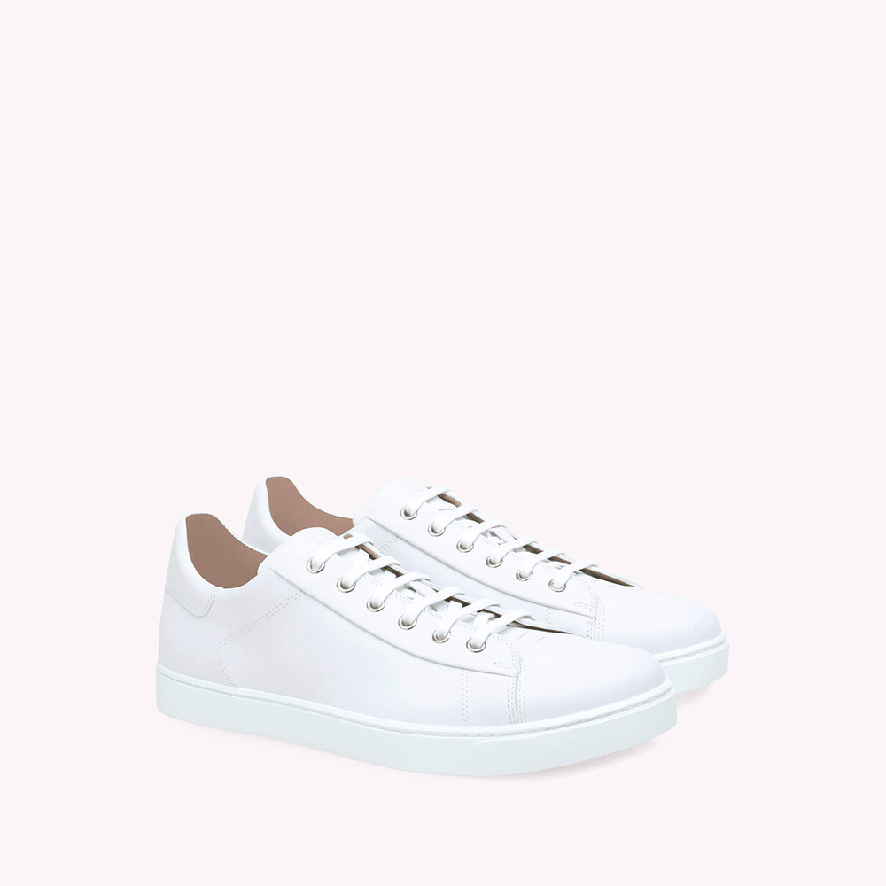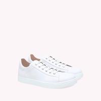 メタルアイレットで装飾されたレザー製のLow Topスニーカー。シューレースとラバー製のソールは本体と同系色で揃えています。