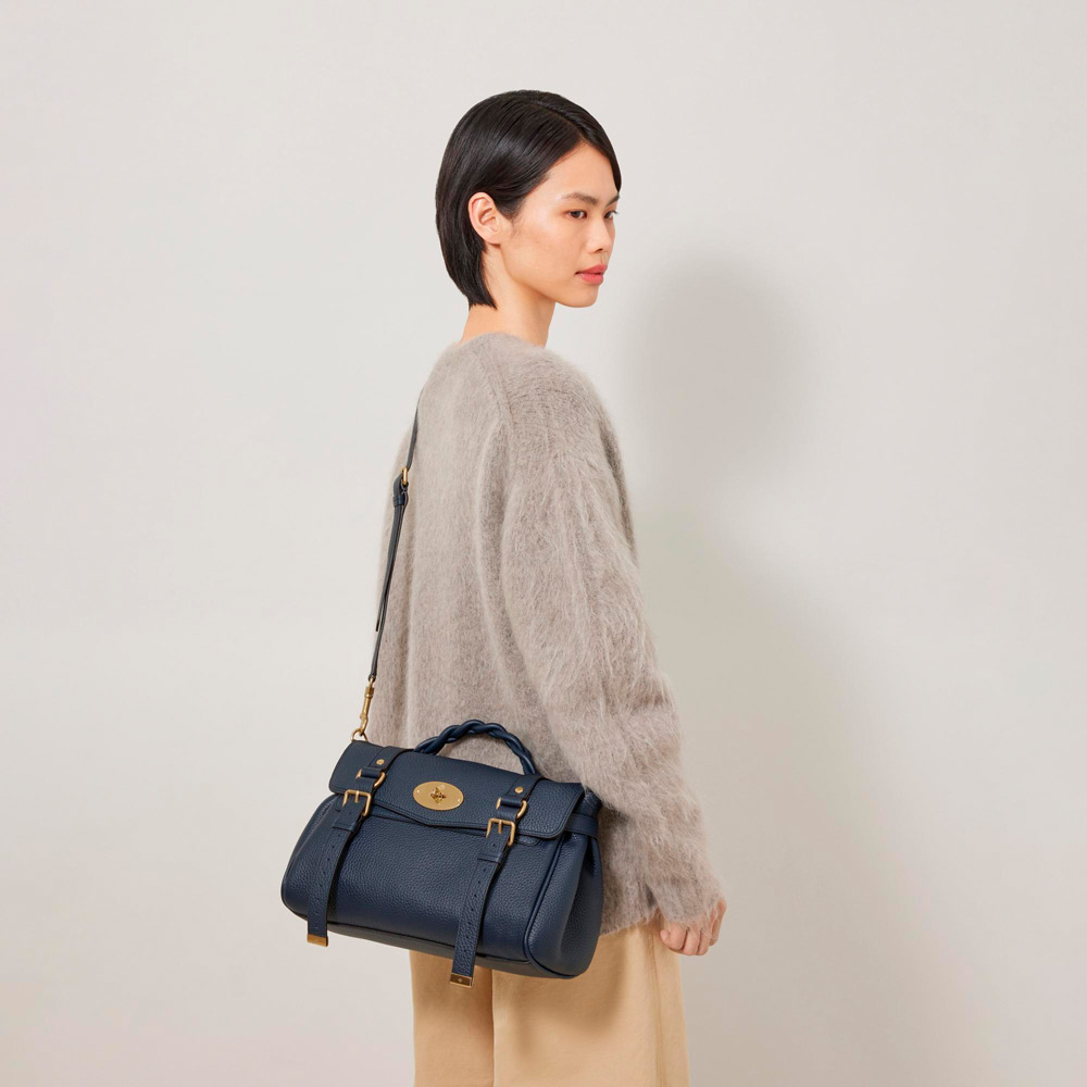 ベイズウォーターとエルキントン ブリーフケースという、マルベリーが誇る2つのアイコンモデルの要素を掛け合わせ、エフォートレスなサッチェルバッグに仕上げたアレクサ。マルベリーのシグネチャーであるポストマンズロックに加え、ベルトバックルやストラップを備えており、気品ある落ち着いたデザインが魅力です。編み込みレザーのトップハンドルと長さ調節可能なショルダーストラップが付いており、手持ちや肩掛けなど、さまざまな持ち方に対応します。
