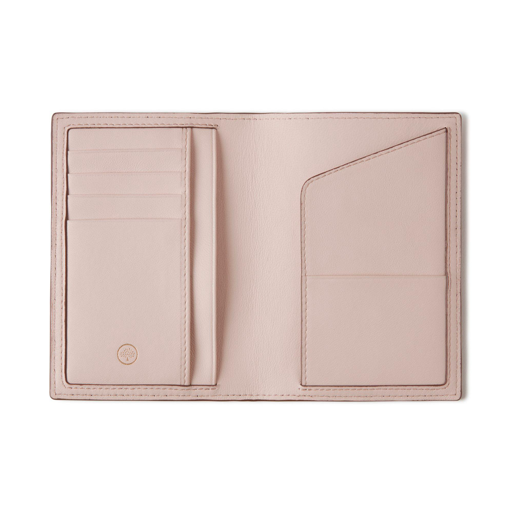 標準サイズのパスポート用にデザインされたマルベリーのパスポートカバー。ナッパレザーの裏地が付いたカバーの内側には、4つのカードポケットと3つのスリップポケットを備えており、箔押しエンボス加工のマルベリーロゴがあしらわれています。