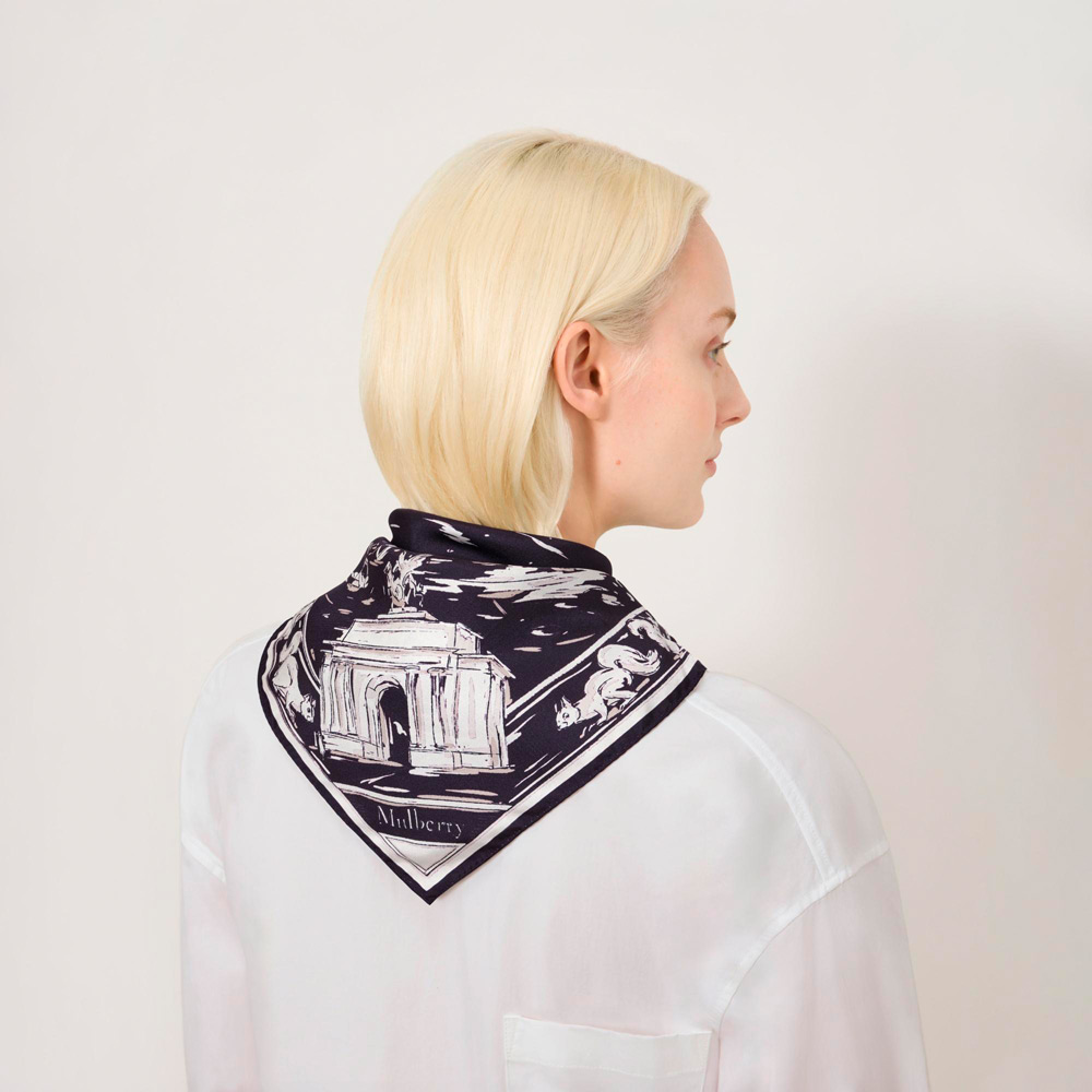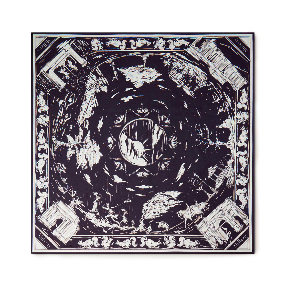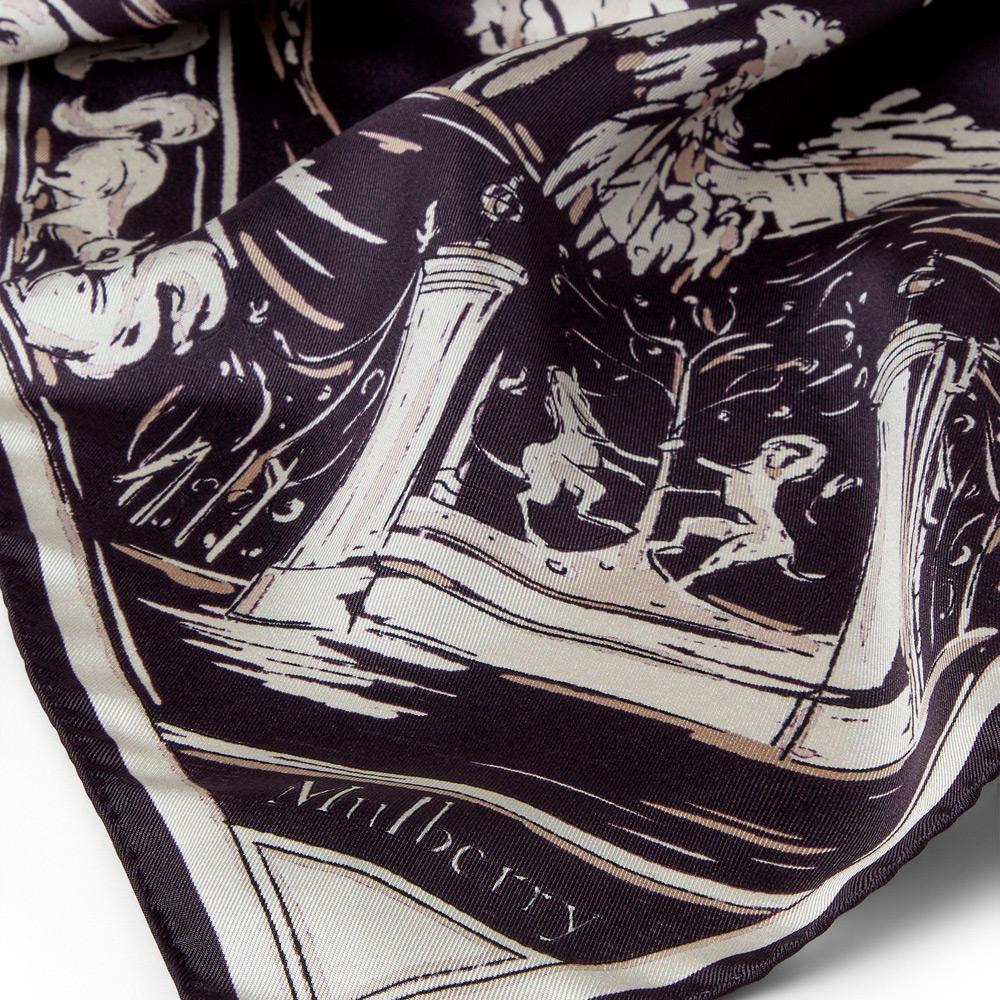 柄をプリントしたシルクツイル100%のスカーフ。首元に巻いても、お気に入りのマルベリーバッグに巻いてもお楽しみいただけるアイテムです。