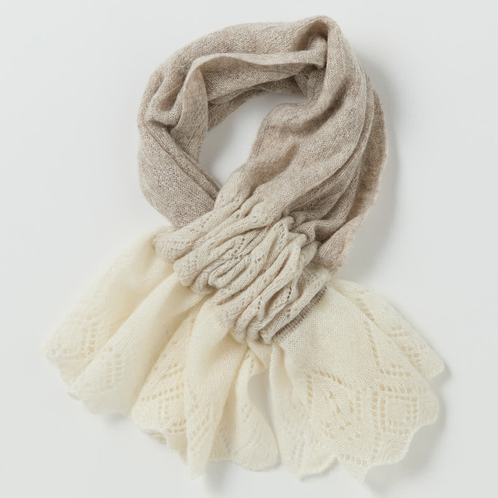 レースのような編地がエレガンスな印象のプチマフラーです。ギャザーが寄ってふんわりとした優しい表情に。差し込むだけでお洒落にドレスアップできます。