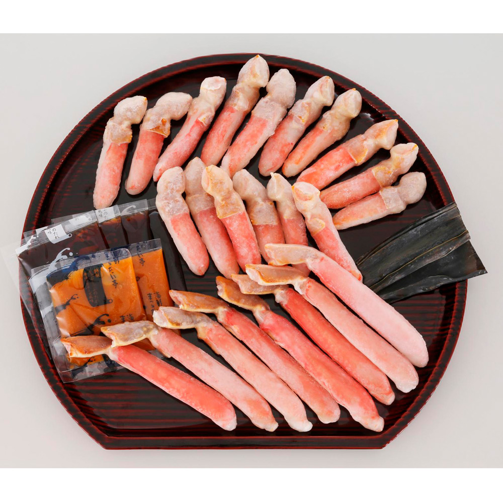 生ずわいがに棒ポーション250g(カナダ産)、生ずわいがに爪下ポーション360g(カナダ産)、だし昆布1枚(5g)、ポン酢風味たれ30g×4、辛口マヨネーズ風味たれ30g×2