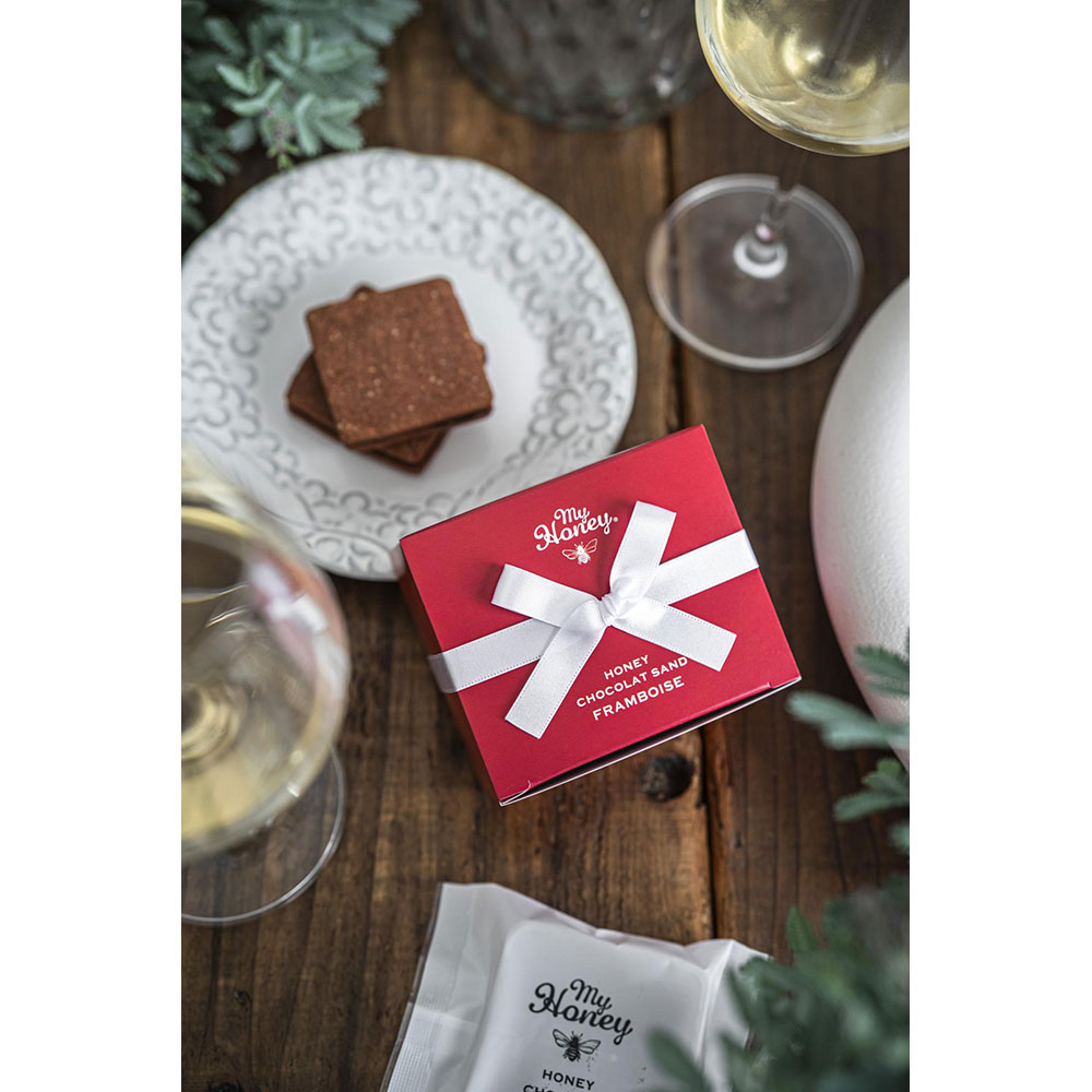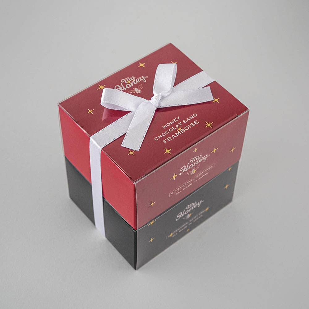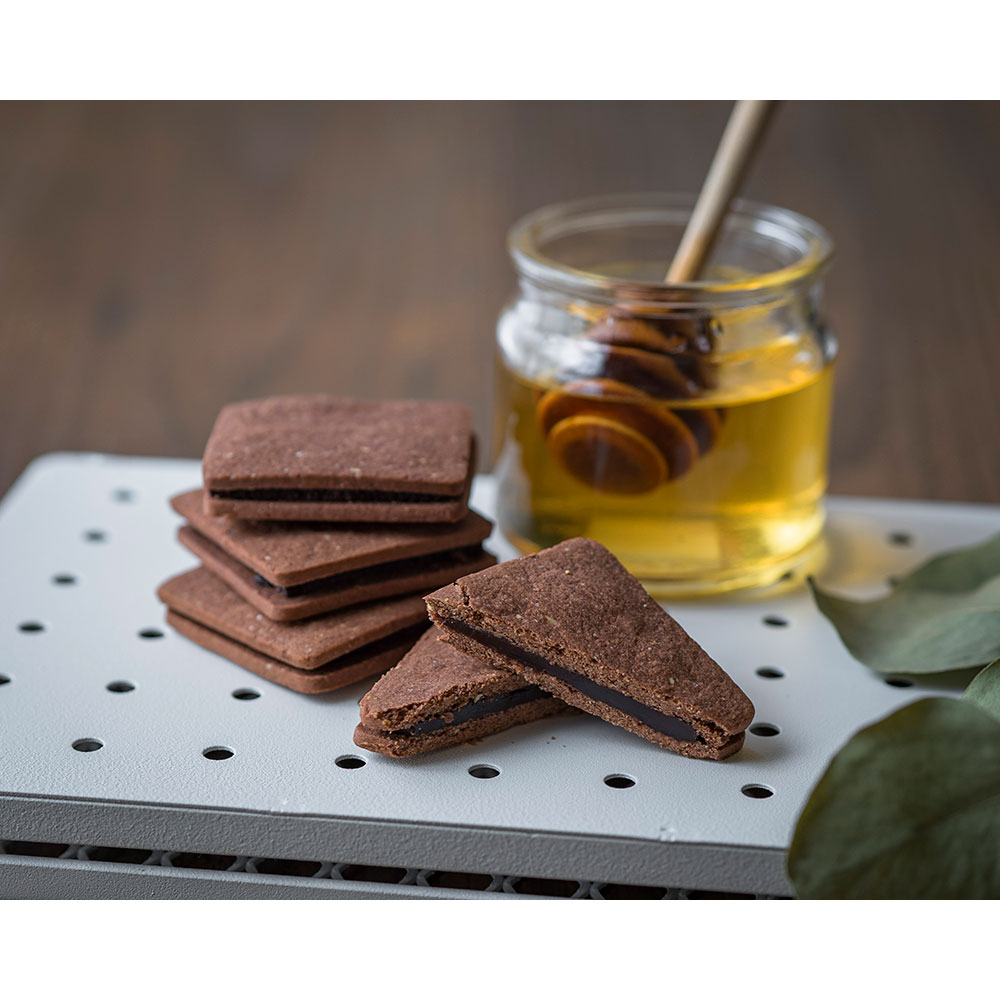 デイリーフリー(乳製品不使用)、たまごフリー、グルテンフリー(小麦粉不使用)。甘さは「アカシアはちみつ」だけ。1枚ずつ手作りで仕上げたショコラサンドです。お口に含んだ瞬間カカオの香りとはちみつの甘さが、舌いっぱいに広がります。スッキリとした甘さのチョコレート味と、少し甘酸っぱいフランボワーズ味の2種類が同時に楽しめるセットをお届けします。
