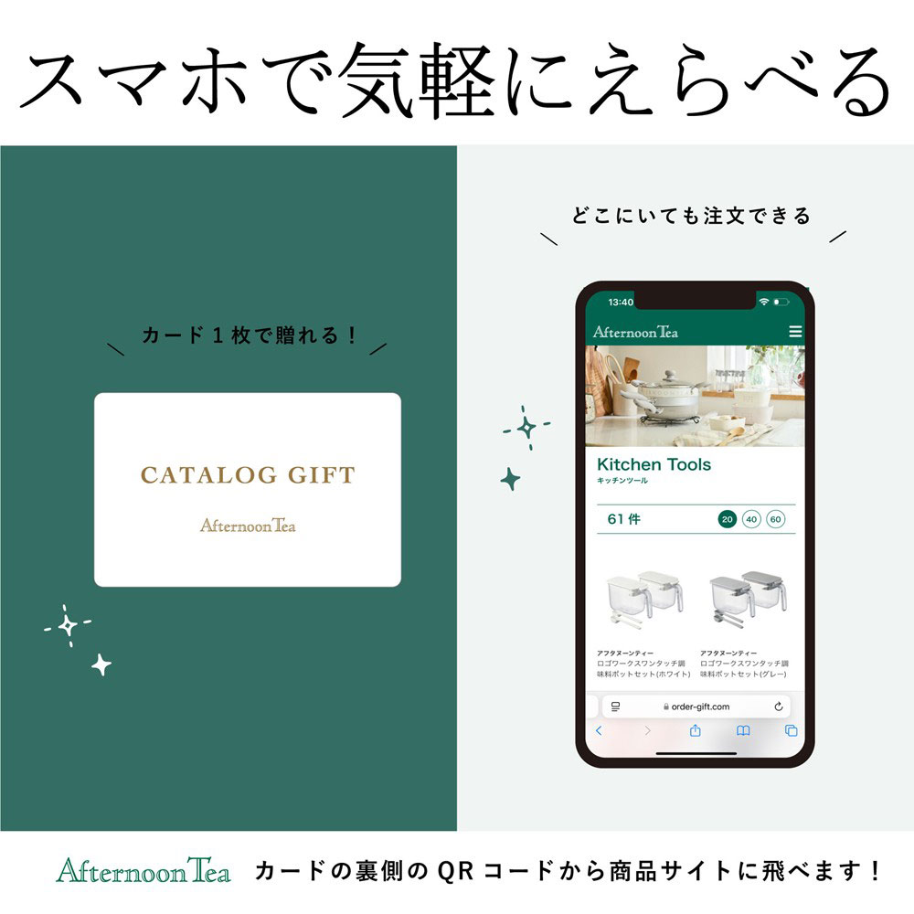 Afternoon Teaらしい華やかで心躍るアイテム満載のギフトの新定番。カードで贈るカタログギフトには、アフタヌーンティーオリジナル商品をはじめ、毎日の暮らしを彩るアイテムをお取り揃え。選んで楽しいギフトカタログを、ぜひ大切な方への贈りものに。カードタイプのカタログギフトは軽量コンパクトで持ち運びやすいのが特徴。遠方からの大切なゲストに、引き出物や内祝いの品として直接手渡しする時にもスマートです。掲載商品の注文は専用Webサイトにアクセス。24時間どこからでも商品が閲覧でき、ハガキを投函する必要もなくご注文いただけます。