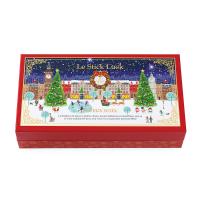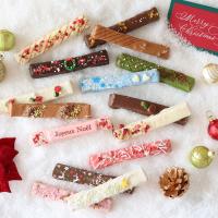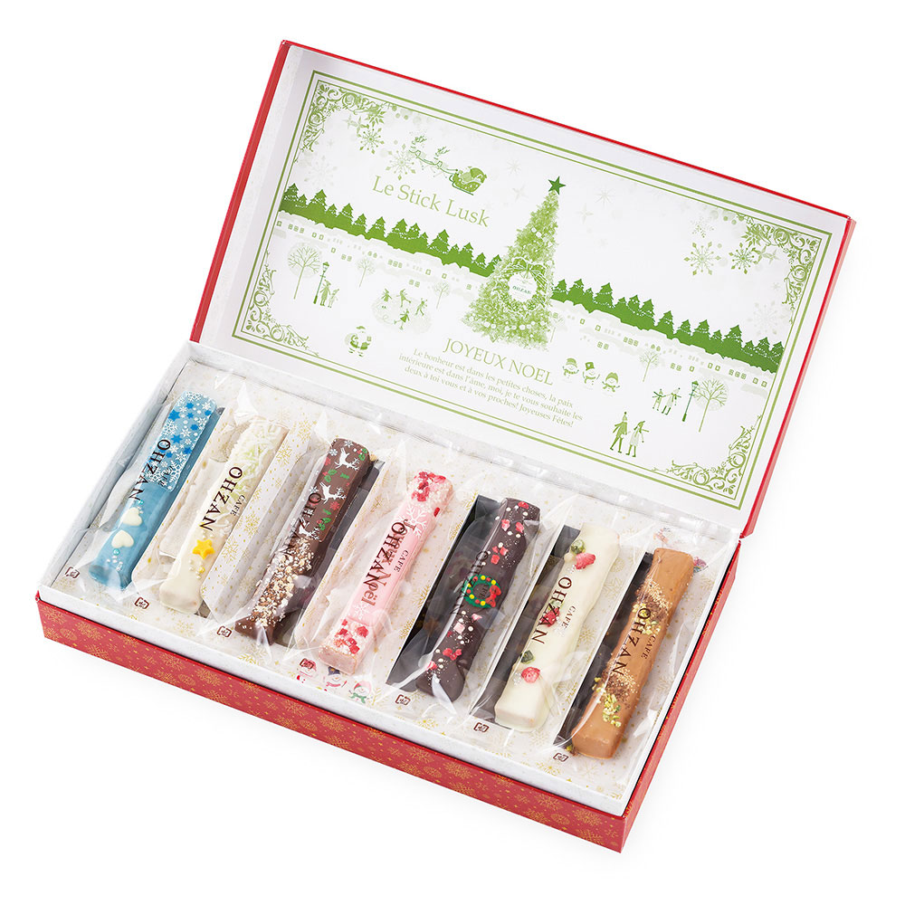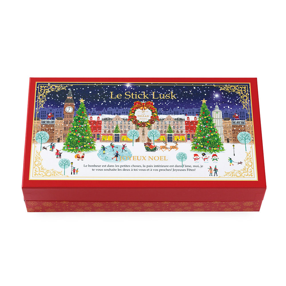 Xmasスティックラスクのデザインはヨーロッパの街並みをohzan風にイメージしました。ホテル前の広場のシーンをイメージ、サンタクロースや雪だるまが登場!雪が降るクリスマスの夜にうきうきしている楽しそうな大人や子供達。よく見るとひそかに建物の上にもサンタさんが・・・スティックラスクのプレート「Joyeux Noel」はフランス語でメリークリスマスの意味。他にもメレンゲでおつくりしたクリスマスリースやトナカイ柄のシートで演出しています。ミルク、ビター、ホワイト、ストロベリーにキャラメル、抹茶、何種類ものチョコレートをベースにストロベリーやラズベリー、刻んだアーモンドやピスタチオ、クランチチョコも使いながら様々なバリエーションをご用意しました。ベルギーチョコをふんだんに使ったスティックラスク、全て今だけの限定ラスクが入っています。1箱のギフトがみんなを笑顔にする。パッケージのストーリーと華やかなラスクが輝きを放って、楽しい会話が始まります。